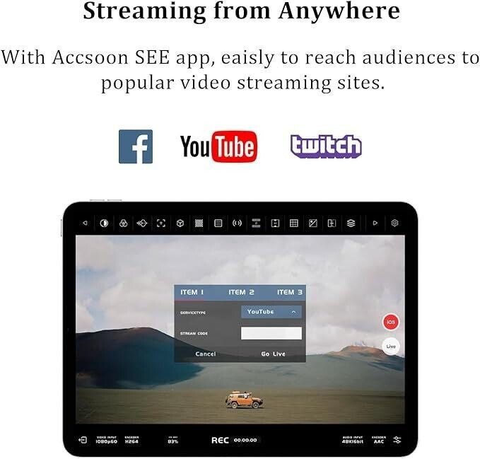 Con l'app Accsoon SEE, puoi raggiungere il tuo pubblico da qualsiasi luogo utilizzando RTMP per siti di streaming video popolari come Facebook Live, Twitch e YouTube.