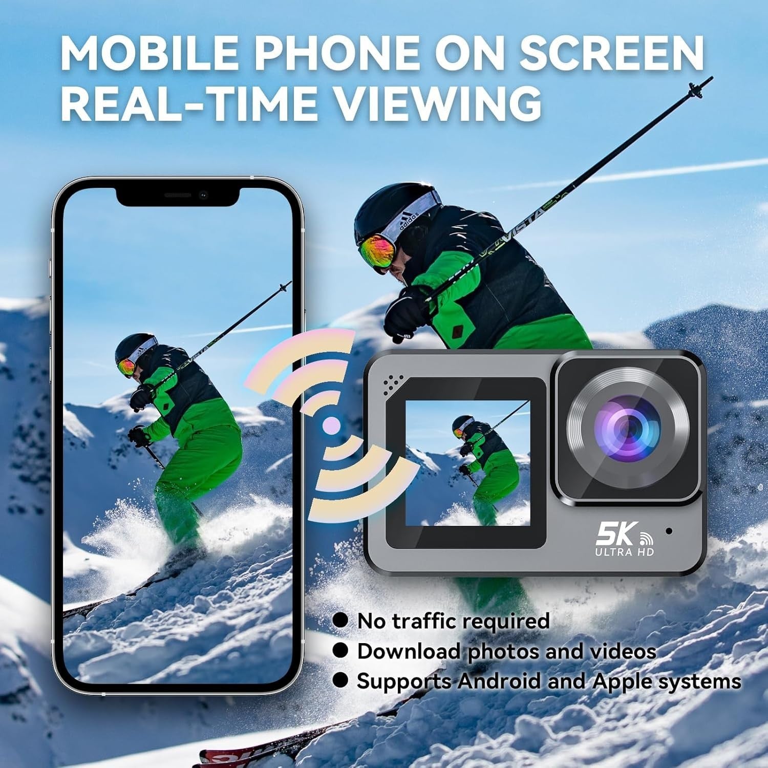 Action Cam 5K: questa action cam ti consente di registrare video 5K a 30 FPS e scattare foto con un'alta risoluzione di 48 MP, offrendoti un risultato fotografico eccezionale. Che si tratti di catturare i dettagli di un movimento rapido o di fotografare l'intero panorama di una scena ampia, riesce a registrare con precisione e chiarezza. Ogni immagine è vivida e reale come la scena originale, rendendo la tua creazione ancora più semplice.
