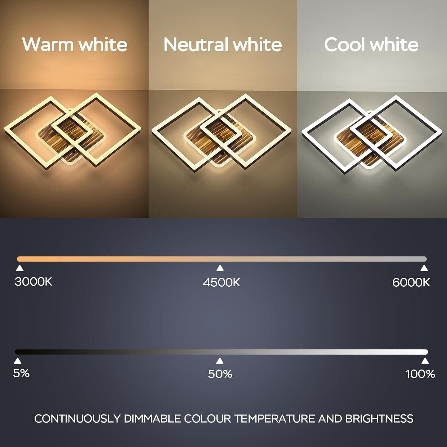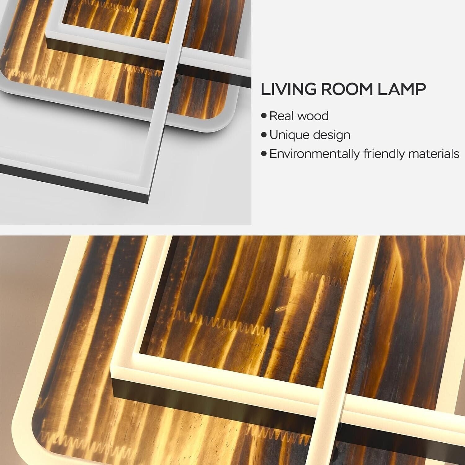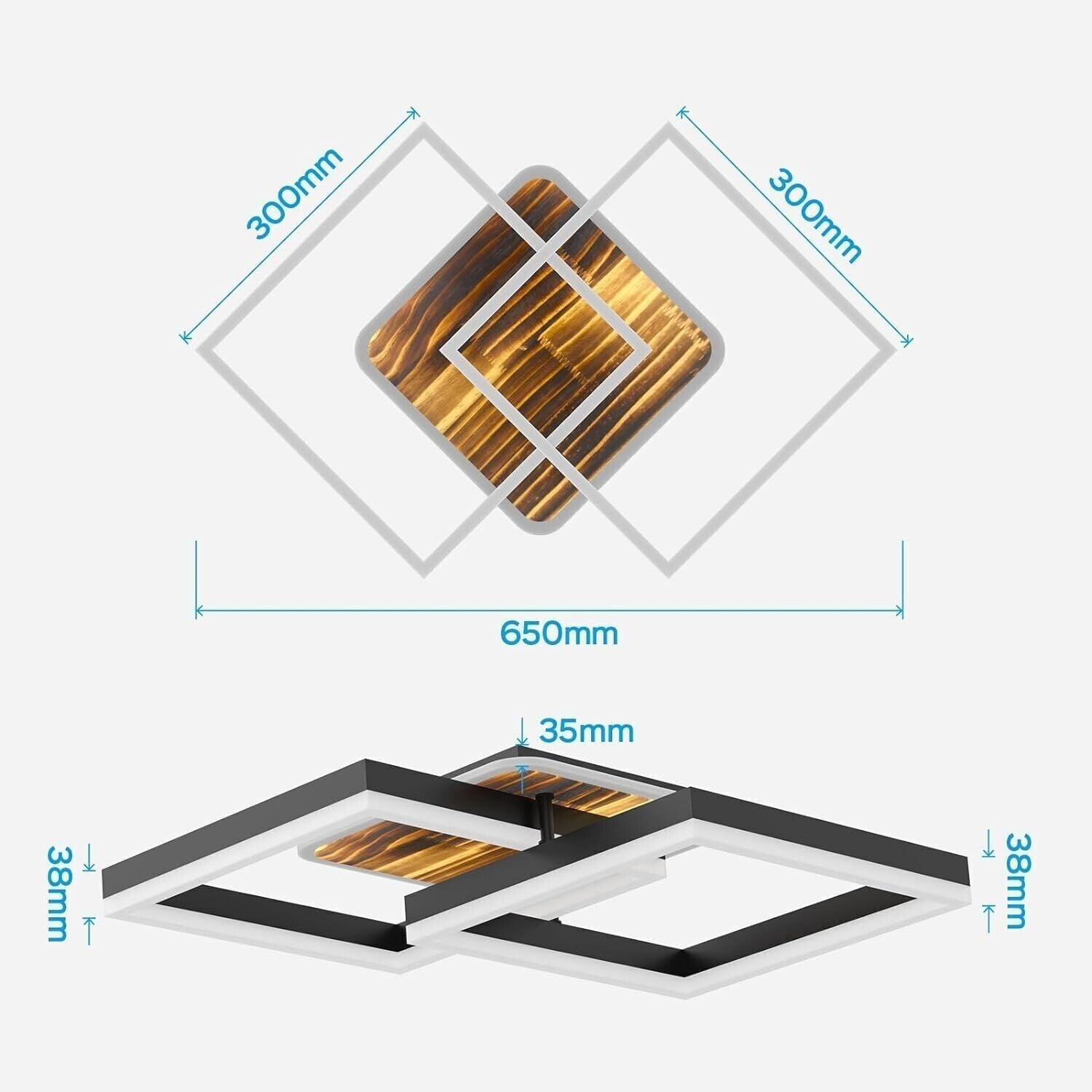 DISEÑO GEOMÉTRICO: Esta lámpara de techo LED tiene un diseño geométrico formado por dos grandes marcos cuadrados superpuestos y un pequeño marco cuadrado de madera. El diseño lineal confiere dinamismo a la luminaria y la convierte en un auténtico reclamo.