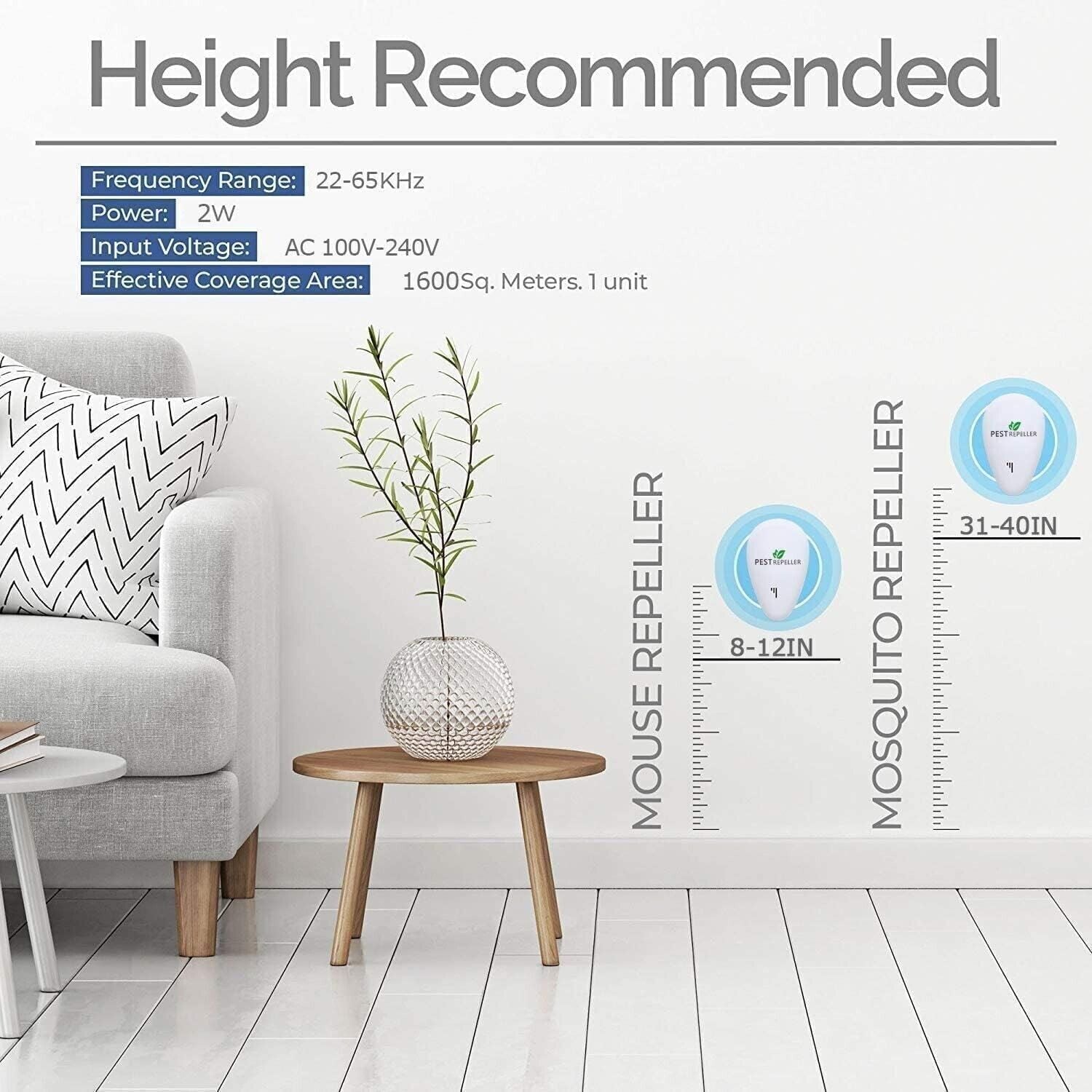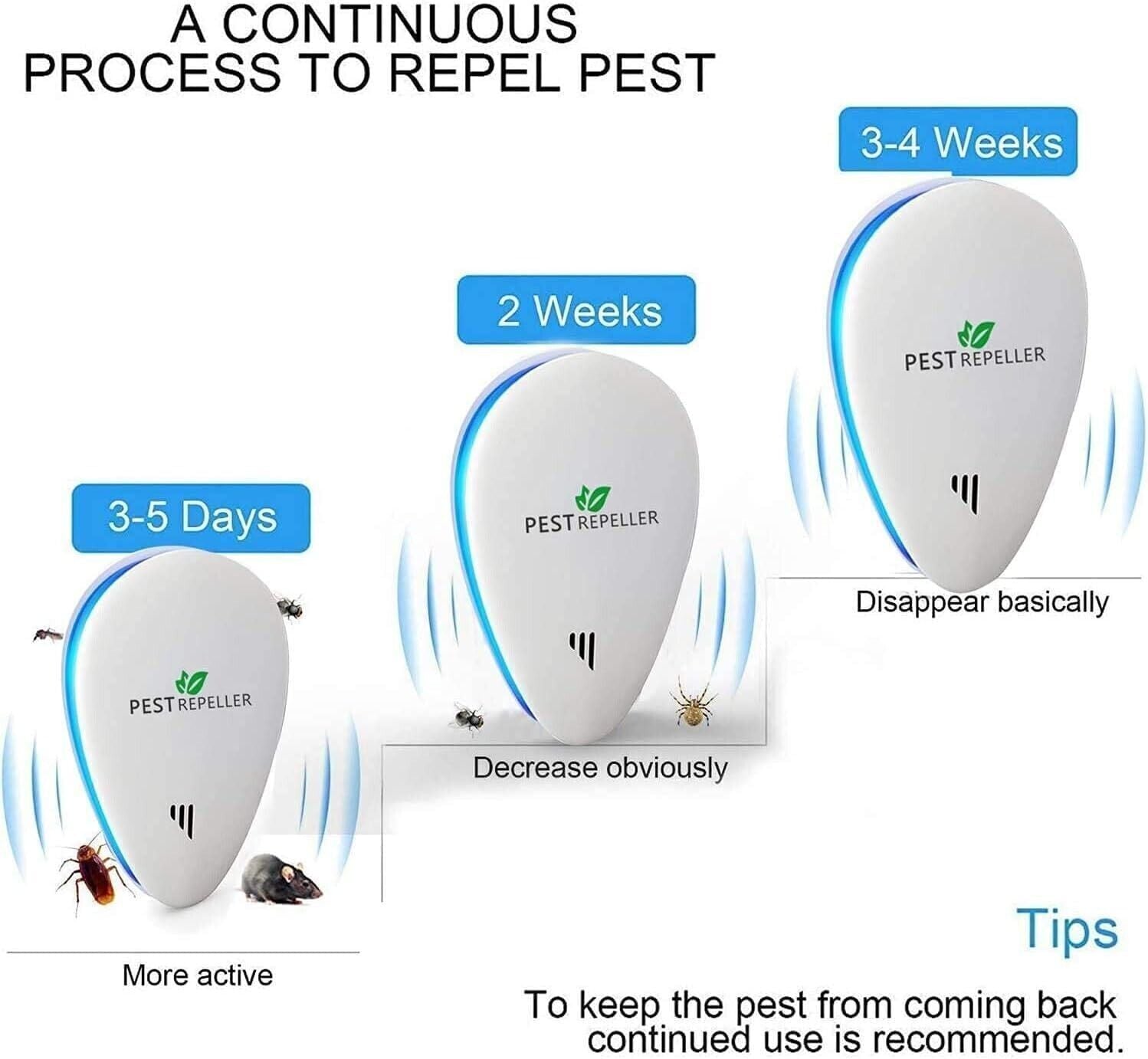 FACILE DA USARE: Basta collegare il antizanzare ultrasuoni dei parassiti alla presa a 30-150 cm di distanza dal pavimento e assicurarsi che non ci siano barriere come tende o armadietti che coprono davanti al repellente. La maggior parte dei clienti può vedere i risultati entro 3-4 settimane! Allora possiamo dire addio a parassiti e topi.