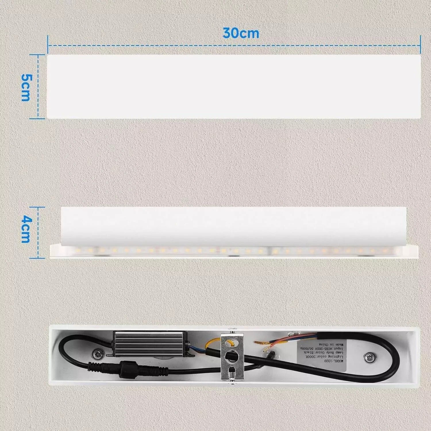 Dimensioni della Applique: 300 * 50 * 40mm, angolo di luce: 120 °, potenza: 10W, materiale: alluminio, colore del corpo: bianco, bianco caldo 3000K.