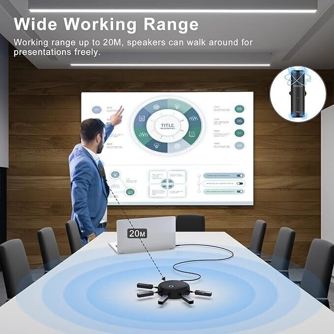 Ampio raggio d'azione. Basato sulla tecnologia a 2,4 Ghz, il sistema microfonico per conferenza USB è in grado di offrire un suono cristallino e ad alta risoluzione con potenti capacità di trasmissione. Grazie ai trasmettitori e ai ricevitori wireless e all'altoparlante regolabile a 15 livelli di volume, il raggio d'azione può raggiungere al massimo i 20 metri e i relatori possono camminare liberamente per le presentazioni e sentirsi a vicenda senza alzare la voce.