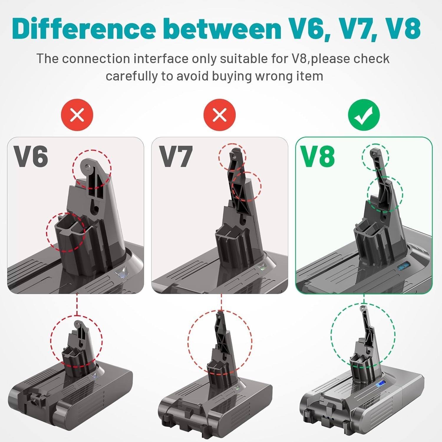 Ampia compatibilità per la batteria Dyson V8: perfettamente compatibile con l'aspirapolvere V8 Fluffy, l'aspirapolvere Animal Cordless HEPA, l'aspirapolvere Absolute Cord-Free, l'aspirapolvere Animal Cordless Stick, l'aspirapolvere Animal Cord-Free, Motorhead, l'aspirapolvere Absolute Stick per peli di animali, ricaricabile con la docking station e il caricabatterie originali (non adatto per V10 SV12)