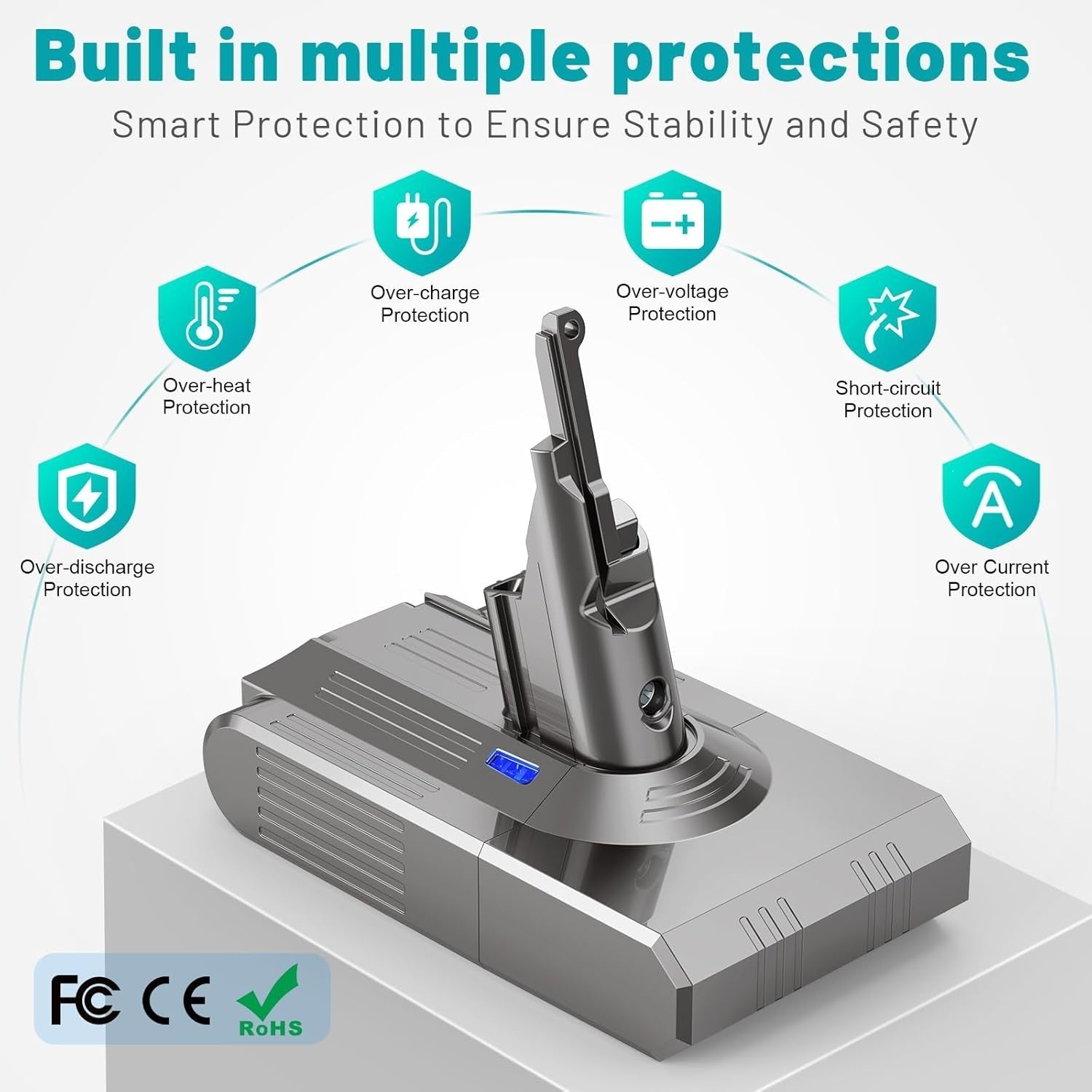 Protezione di ricarica intelligente: la batteria sostitutiva V8 Animal per Dyson è dotata di celle al litio di alta qualità. Protezione integrata contro più circuiti (sovraccarico, cortocircuito, surriscaldamento e sovracorrente).