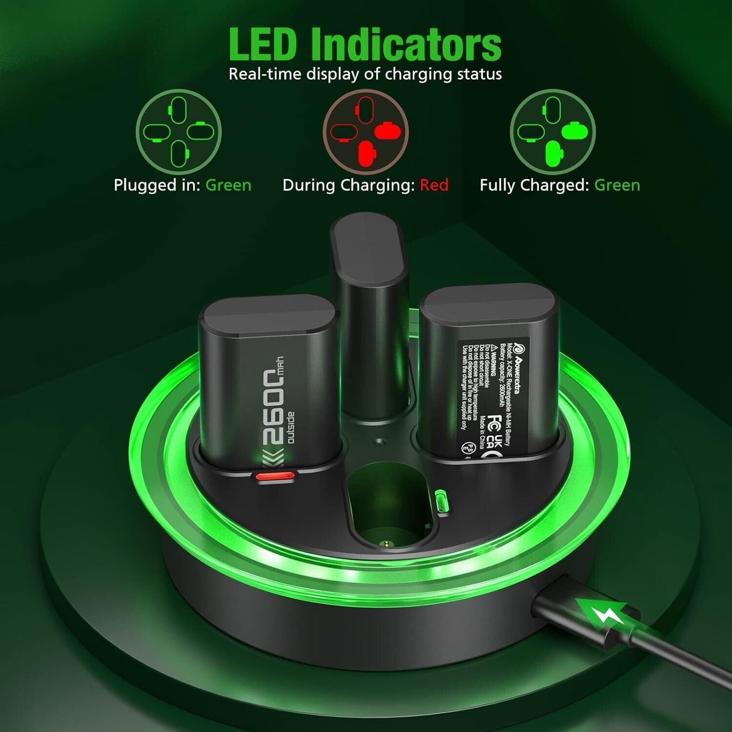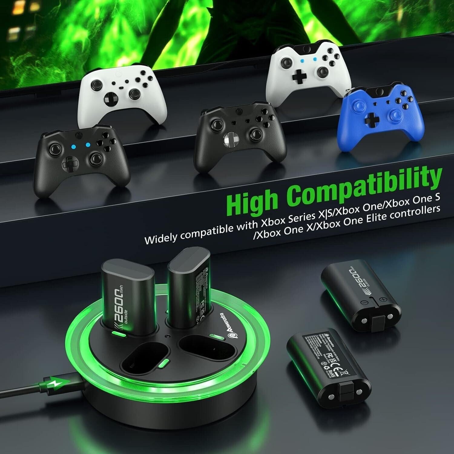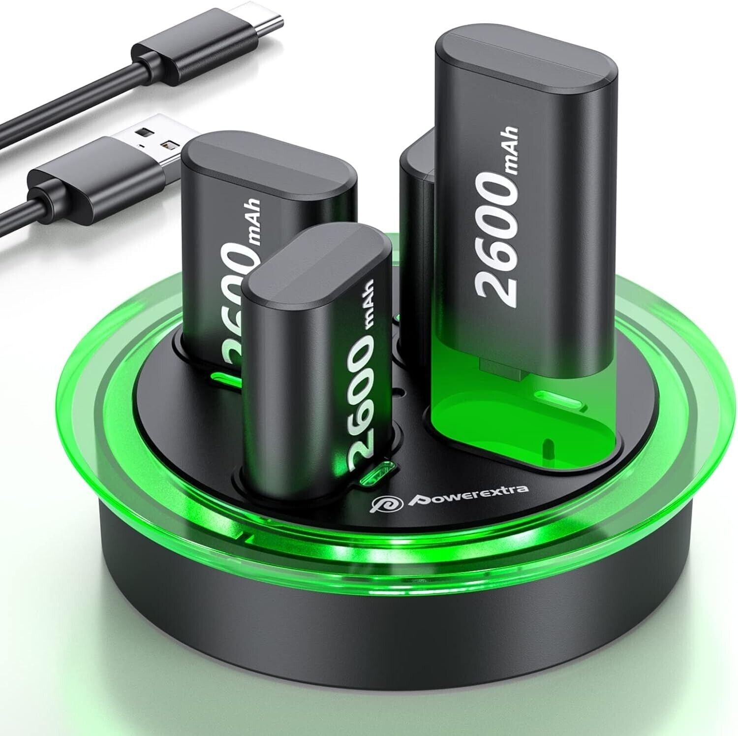 Powextra 4×2600mAh Batteria ricaricabile ad alta capacità per Xbox con stazione di ricarica rapida per controller Xbox Batteria per controller Xbox One S/X, Xbox Series S/X.