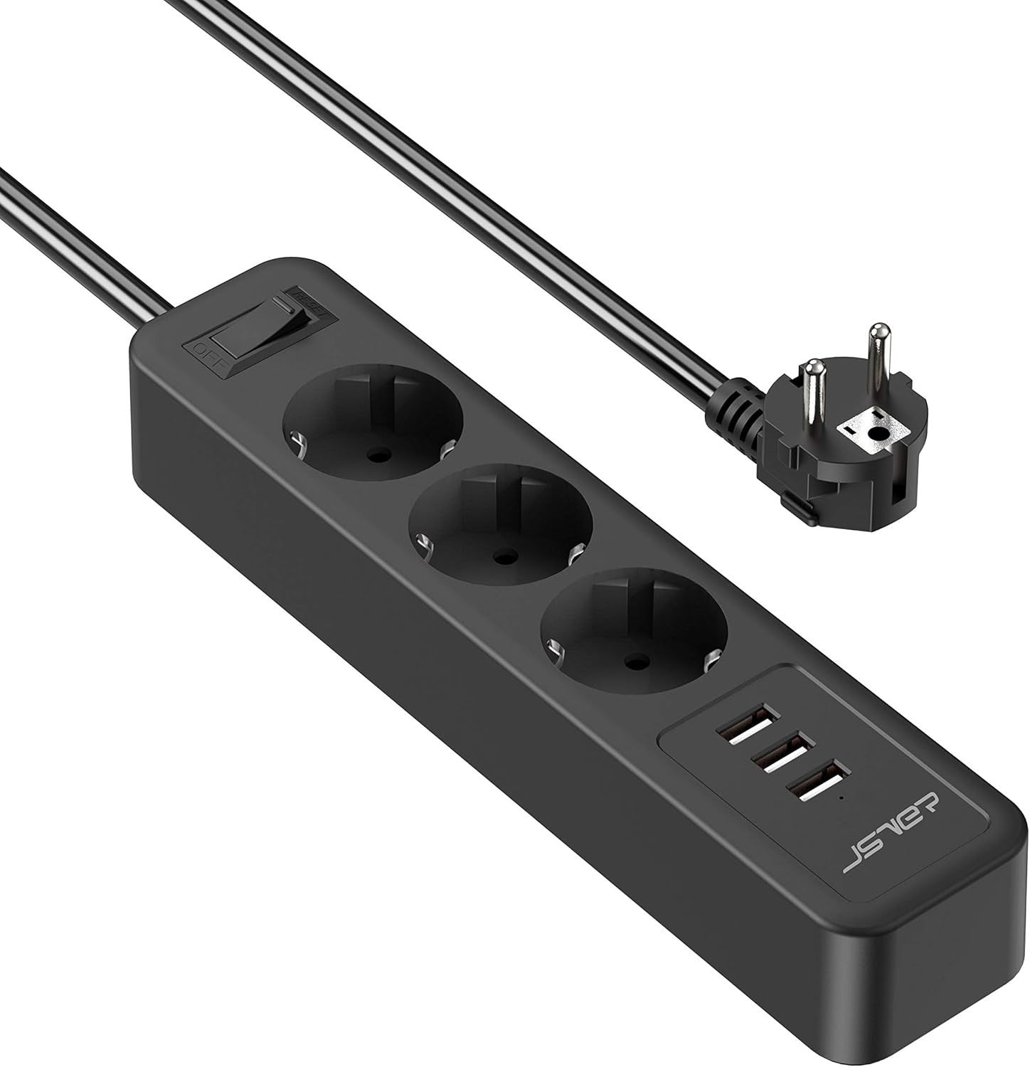 Ciabatta multipresa USB JSVER 3 prese con 3 prese USB, 3 prese (due spine) Protezione da sovraccarico e sovratensione per ufficio, casa o viaggio (nero)