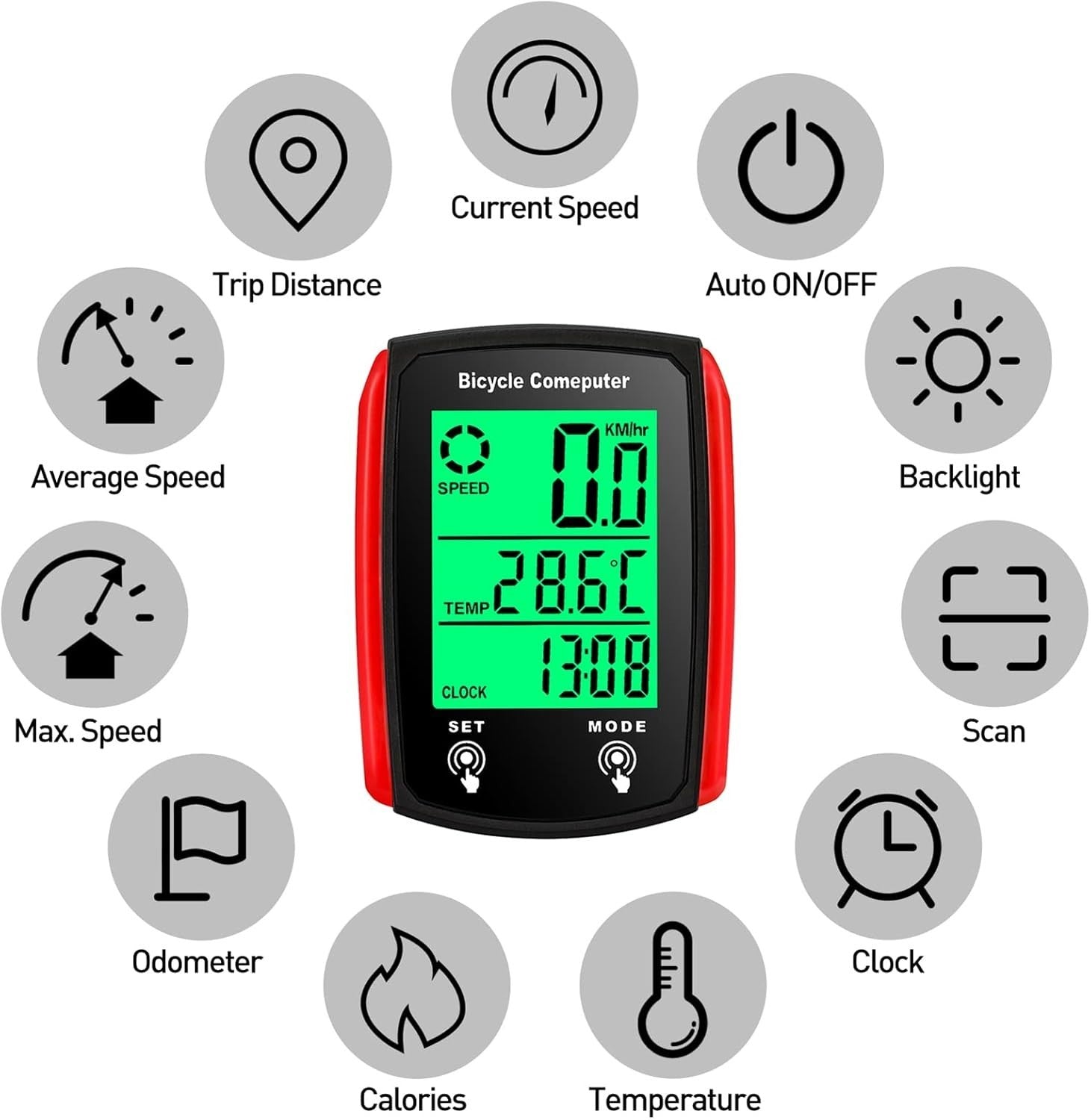 19 funzioni: velocità attuale/massima/media, contachilometri, distanza percorsa, tempo trascorso, calorie, temperatura, scansione, orologio e altro ancora.