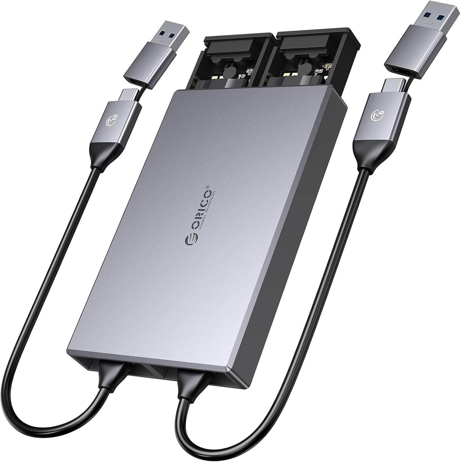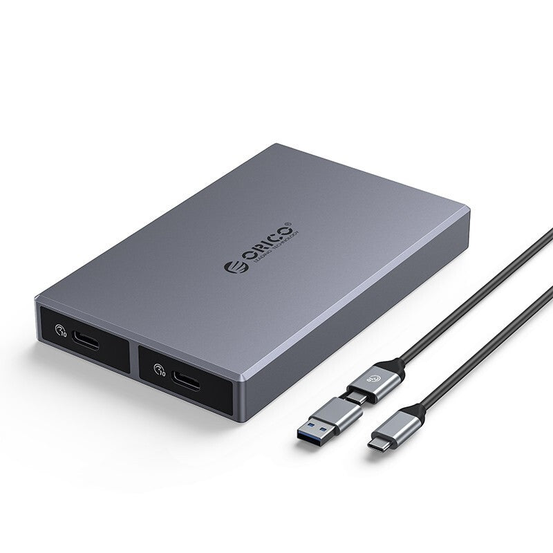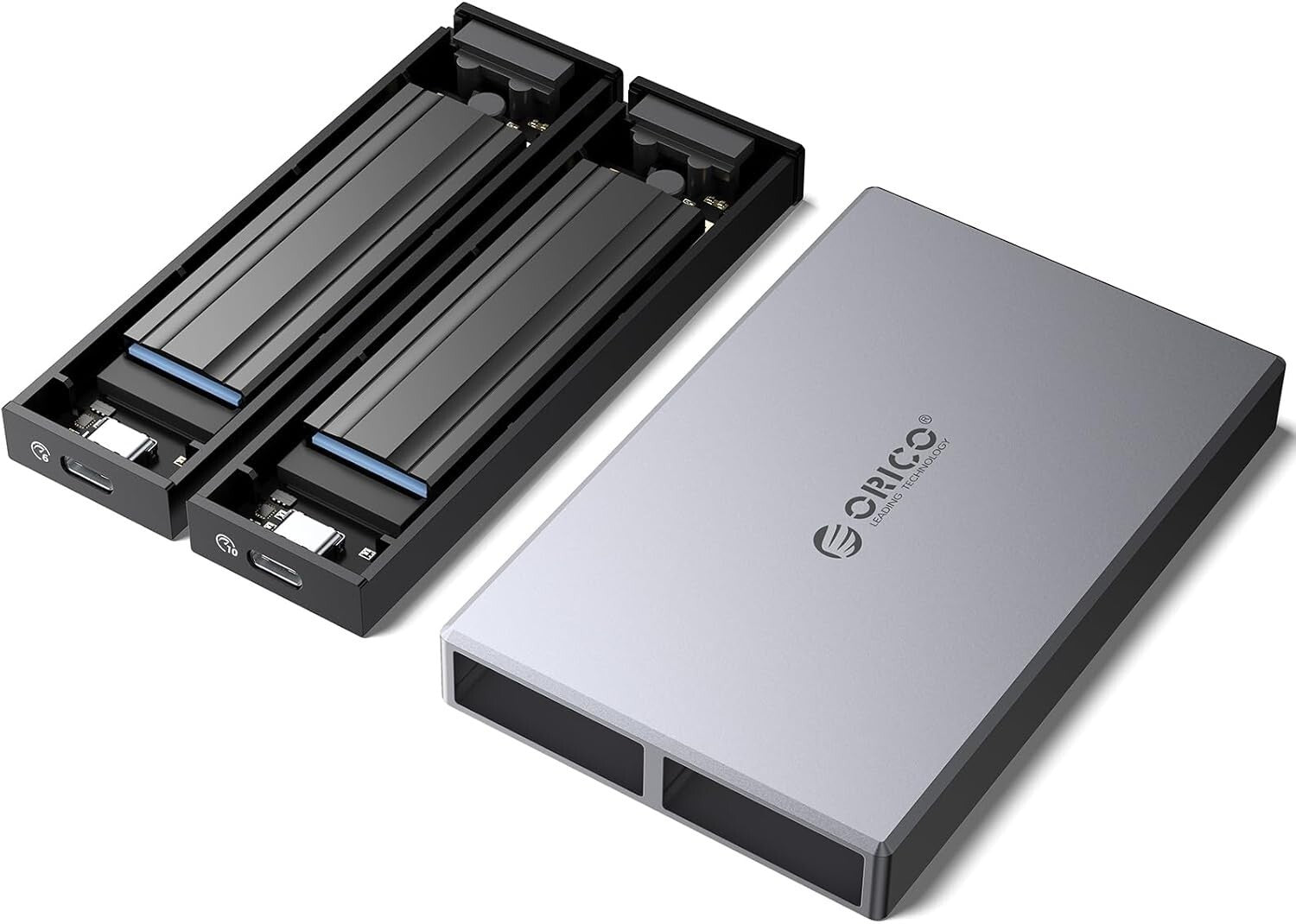 Contenitore SSD ORICO Dual Bay M.2, NVMe da 10 Gbps e SATA da 6 Gbps, capacità fino a 2 x 4 TB, supporta UASP e trim, alloggiamento M.2 in alluminio, per SSD M.2 Key/B Key e B+M Key 2230/2242/2260/2280