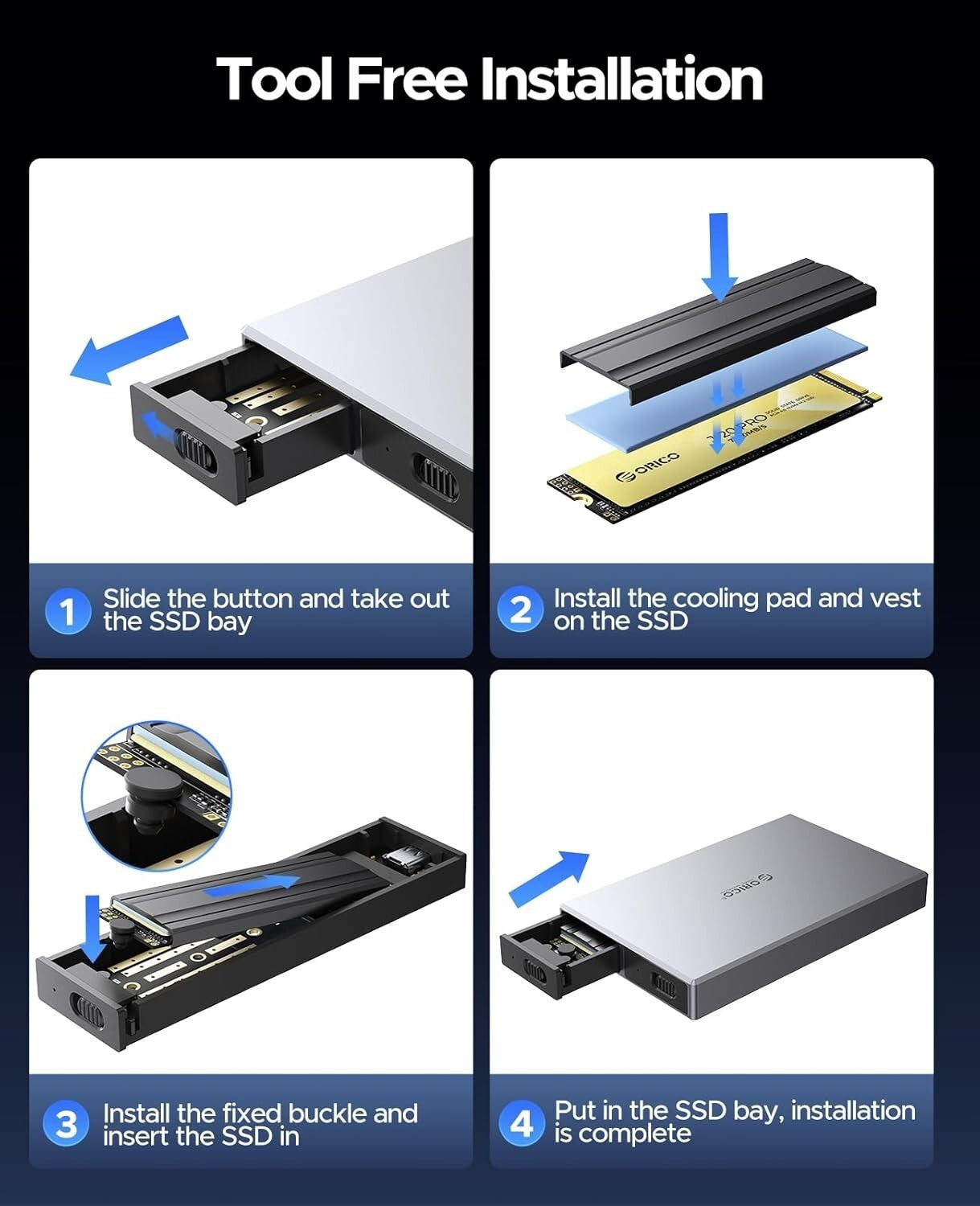 Installazione senza attrezzi: inserisci l'SSD in questo case a doppio alloggiamento e fissalo con un tappo in gomma, quindi collega il cavo USB al dispositivo per utilizzarlo. Non sono necessari driver, basta collegarlo e il gioco è fatto.