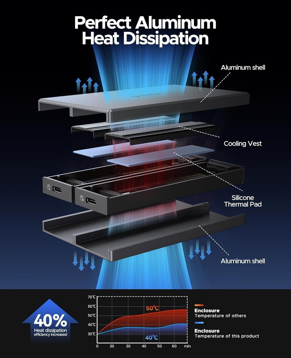 Dissipazione del calore: questa custodia a doppio alloggiamento utilizza materiale in lega di alluminio per l'intera scocca ed è dotata di un gilet di raffreddamento e di un cuscinetto termico in silicone per un migliore effetto di raffreddamento (aumentato del 40%).
