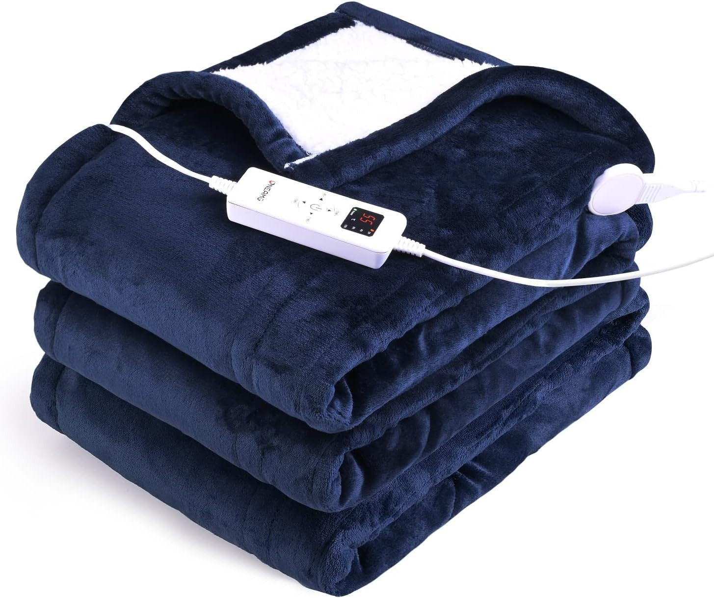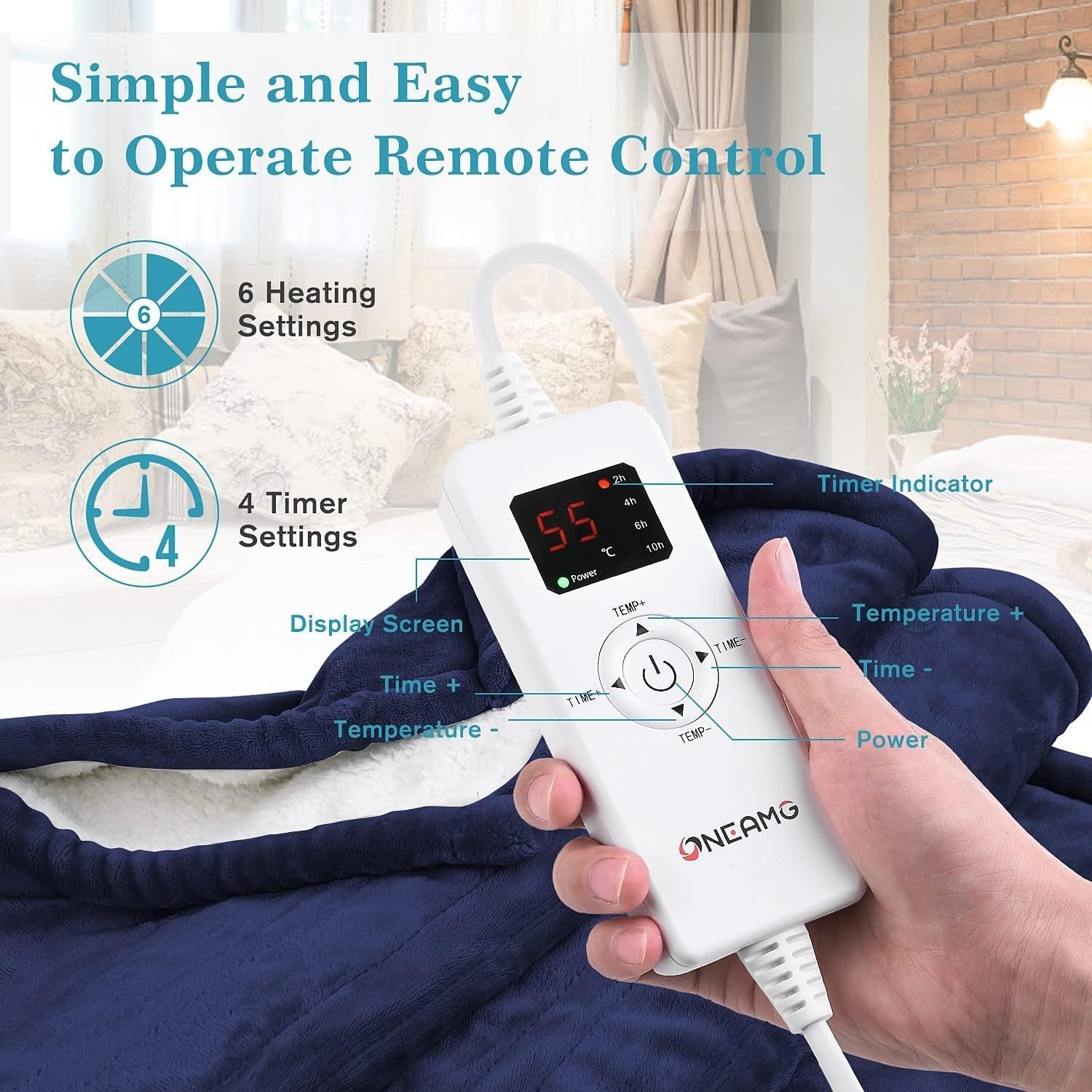 Coperta termica elettrica OneAmg con spegnimento automatico, riscaldamento a 6 velocità (38°C-55°C), temporizzazione a 4 velocità (2H-10H), coperta elettrica lavabile, calda e sicura, blu (127 x 152 cm)