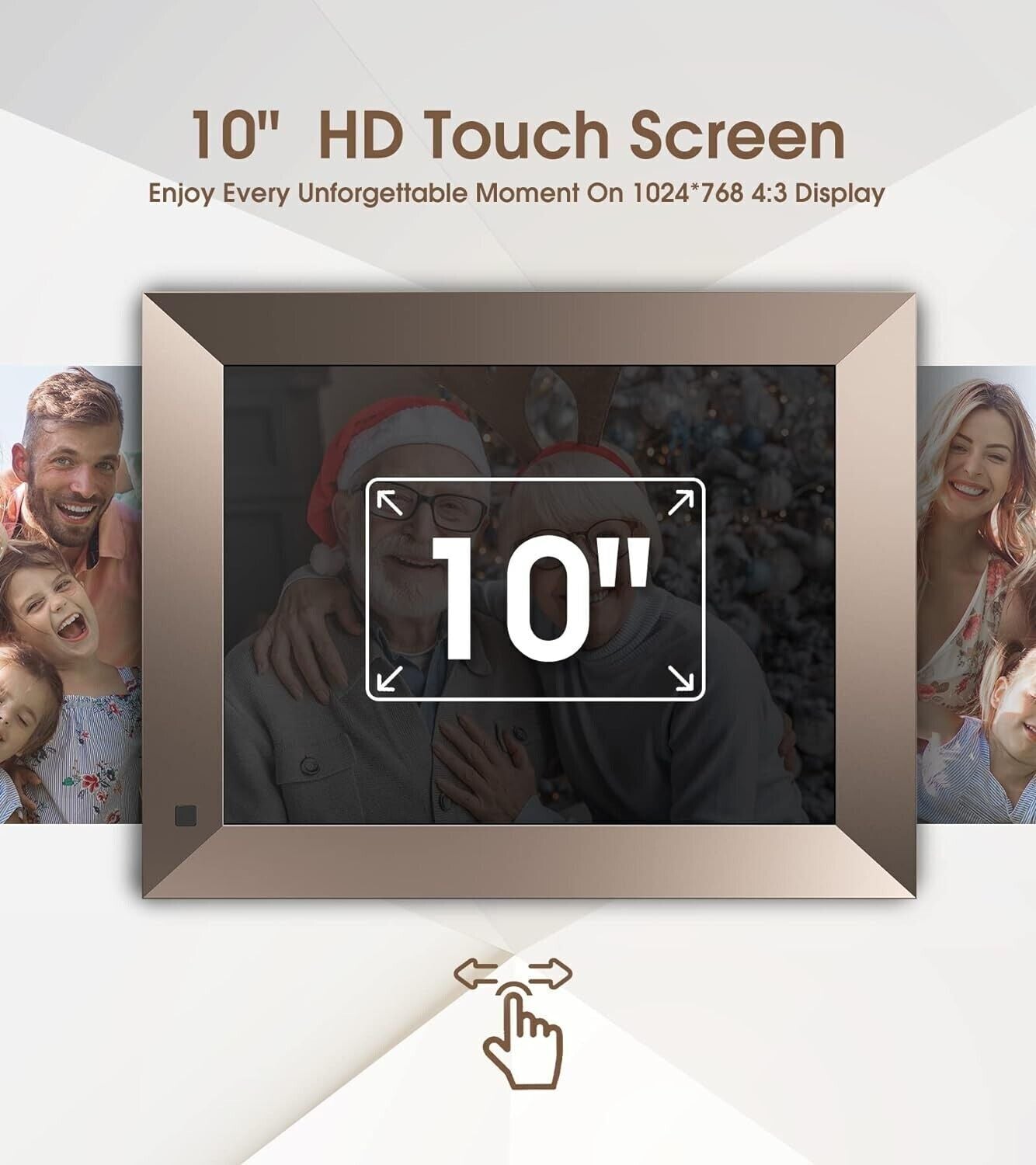 Touchscreen ad alta definizione: touchscreen integrato da 10 pollici con risoluzione del display HD 1280 X 800 e proporzioni 4: 3, che può rimanere nitido con qualsiasi luce e display perfetto da qualsiasi angolazione. La luminosità può anche essere regolata per la visione più comoda nell'impostazione, nessuna preoccupazione: la cornice digitale è troppo luminosa di giorno o troppo scura di notte.