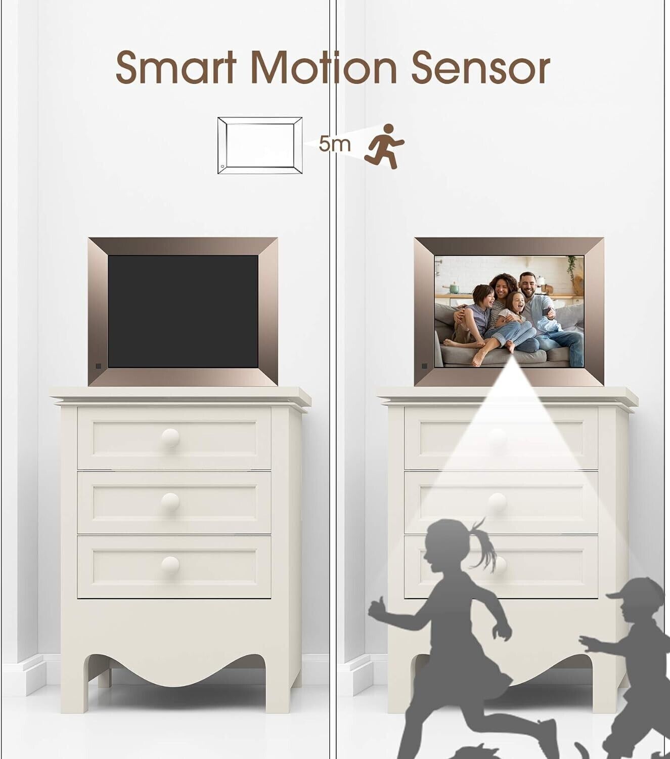 Design unico del supporto magnetico: fornito con un supporto magnetico regolabile e una funzione di rotazione automatica incorporata, che può essere facilmente cambiato in supporto orizzontale e verticale senza viti. Grazie al sensore di movimento intelligente aggiornato, questa cornice digitale può anche rilevare le persone che passano entro 5 metri e quindi accendere automaticamente lo schermo.