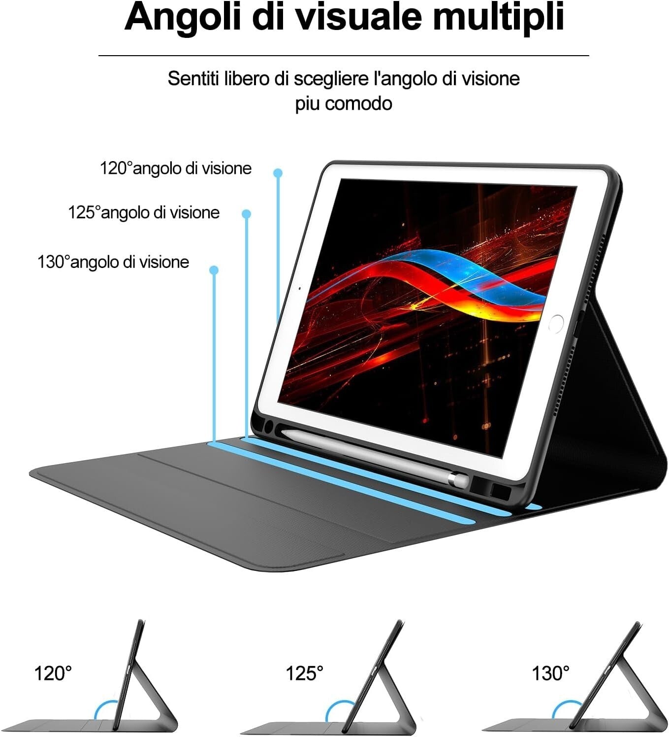 Protezione completa e supporto penna: La custodia protettiva premium per iPad 9a/8a/7a Generazione da 10.2 pollici è realizzata in PU flessibile, protegge il tablet da cadute e graffi accidentali e fornisce una protezione completa del corpo. La custodia della tastiera è dotata di un portapenne integrato in cui posizionare le penne per un facile trasporto e utilizzo. Ritagli precisi consentono l'accesso completo a tutte le porte.