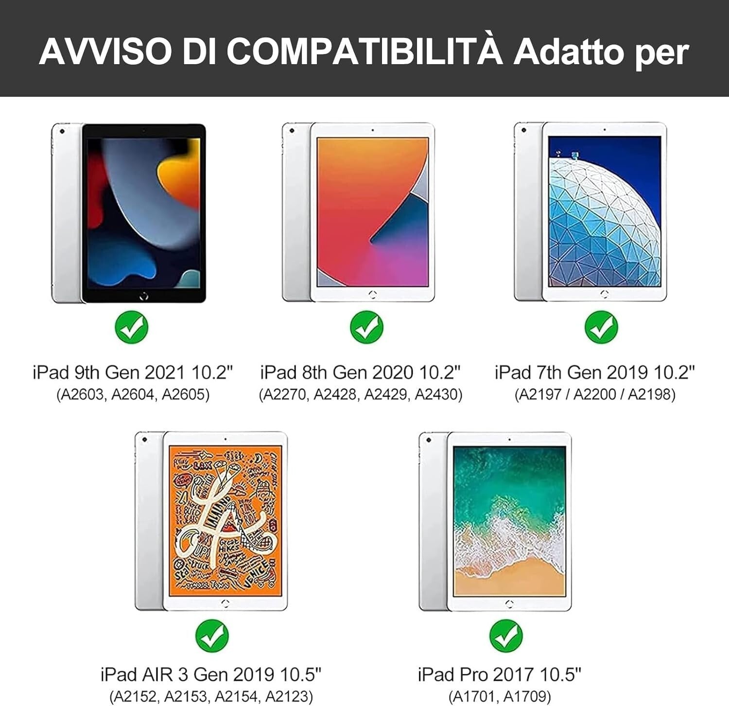 Nuova Custodia per Tastiera IPad 10.2 Pollici: Questa custodia per tastiera per iPad è compatibile con iPad 10.2 9th Gen 2021 (Numero di modello: A2603, A2604, A2605), iPad 8th Generation 2020( Numero di modello: A2270, A2428, A2429, A2430), iPad 7th Generation 2019( Numero di modello: A2197, A2200, A2198), iPad Air 3rd Generation 2019( Numero di modello: A2152, A2153, A2123), iPad Pro 10. 5 2017( Numero di modello: A1701, A1709).Prima dell'acquisto, verificare il numero di modello dell'iPad.