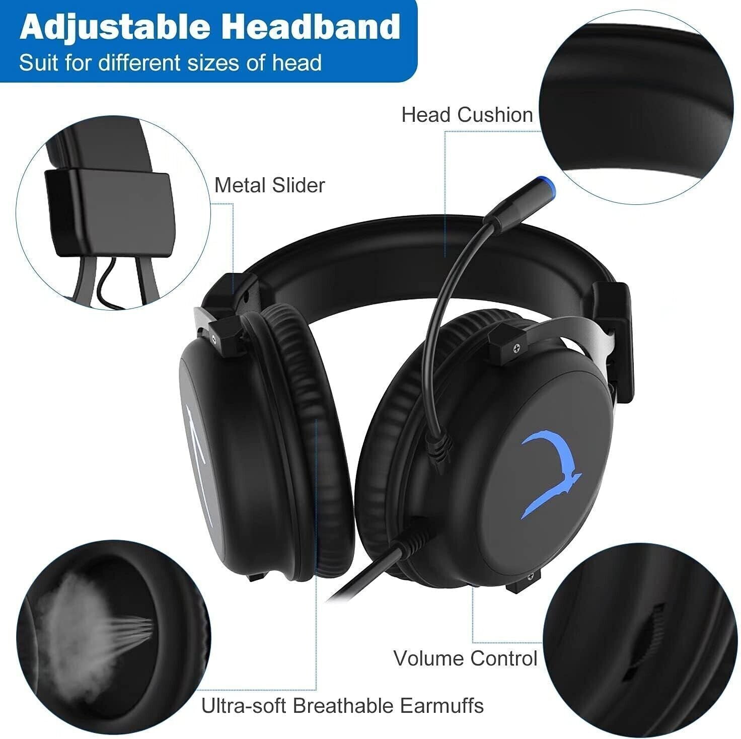 MUTOUREN Cuffie da gioco 7.1 Stereo Surround Sound 57 mm Driver Audio Cuffie USB PC Gaming Cuffie con microfono, isolamento acustico over-the-ear, luce LED Respirante per PC Gamers (nero)