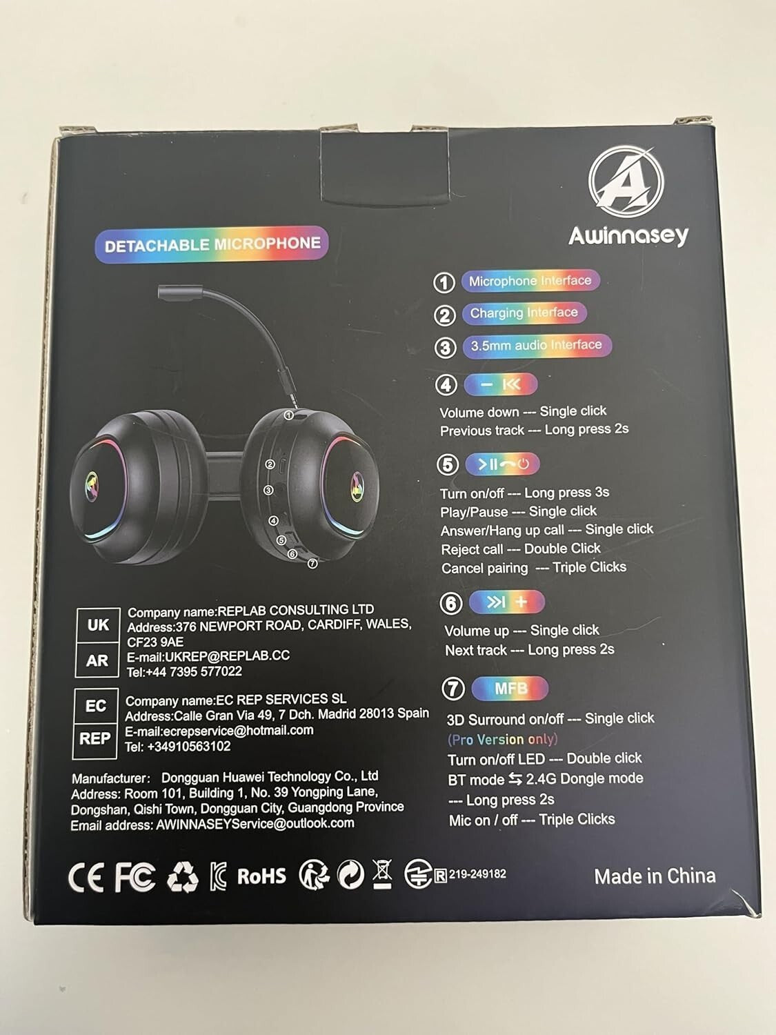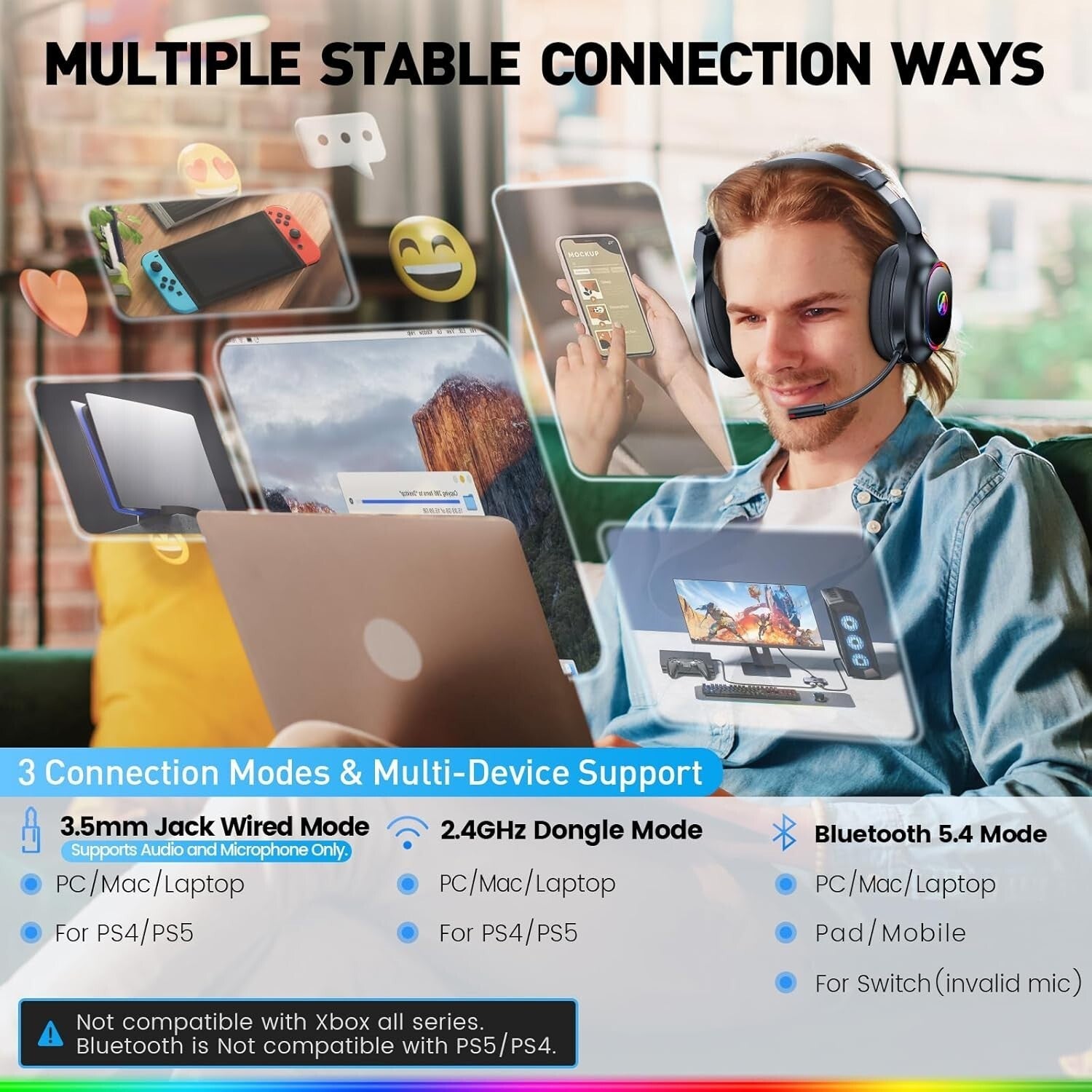 3 Modalità di Connessione e Ampia Compatibilità: Le cuffie wireless Awinnasey migliorate per il gaming offrono molteplici opzioni di connettività: Bluetooth 5.4, dongle USB 2.4G e modalità cablata da 3.5mm. Goditi una latenza ultra bassa (≤20ms) e una portata Bluetooth fino a 15 metri, assicurandoti di non perdere mai un momento dell'azione. Compatibili con PS5, PS4, PC, Mac, Switch, Pad, telefono e laptop, le cuffie da gioco Bluetooth offrono una connessione affidabile e stabile.