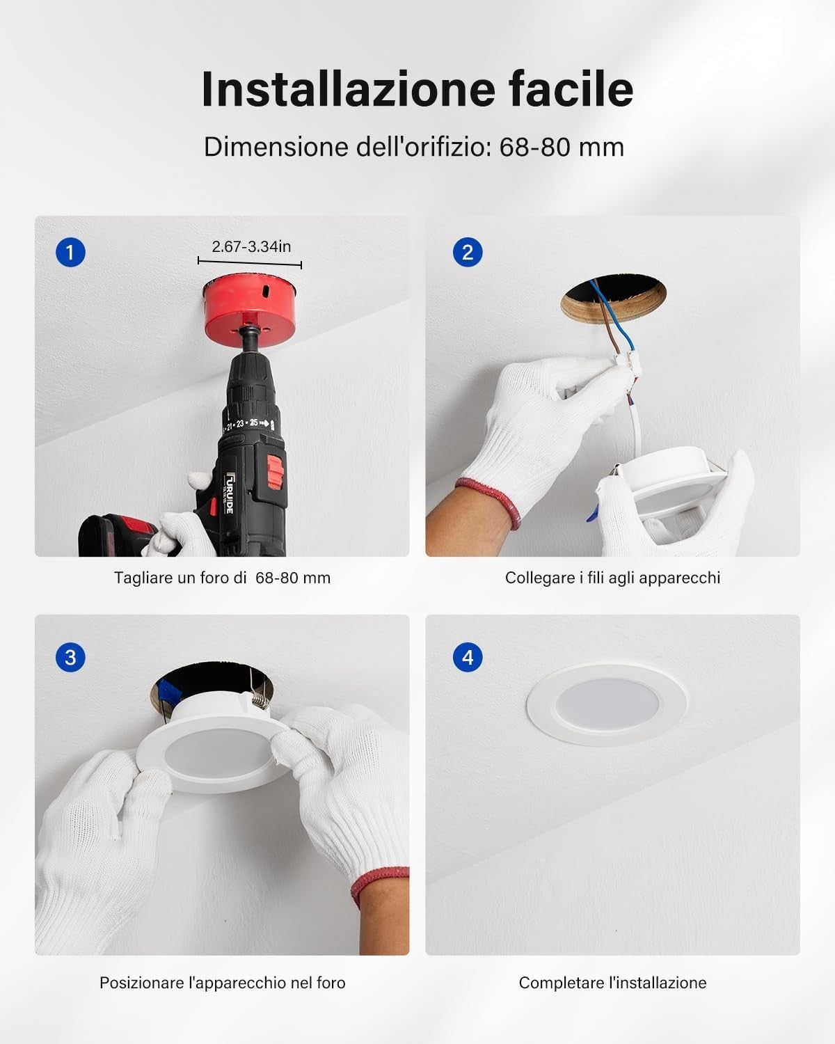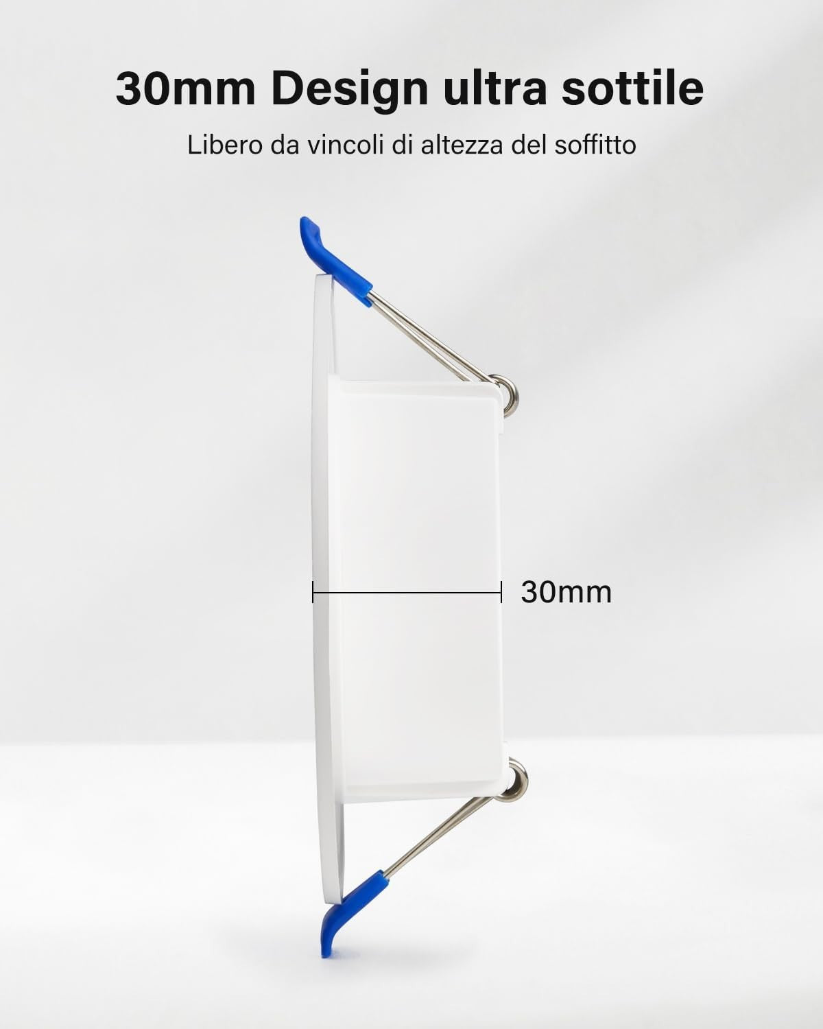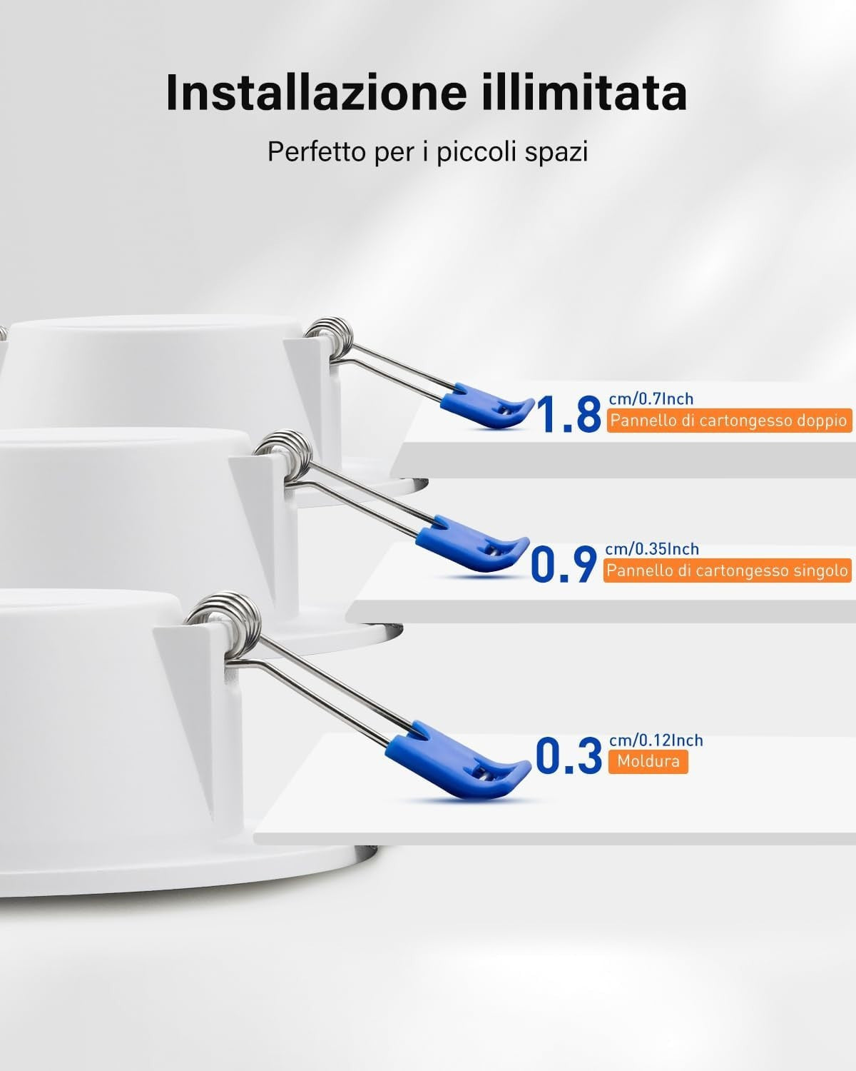 Corpo illuminante leggero e ultrasottile: Questi faretti led incasso hanno un diametro di 100 mm, e l'apertura nel soffitto richiesta è ø70-85 mm. L'involucro è dotato di terminali per il collegamento diretto a una alimentazione a 230V. Con una profondità di montaggio di soli 30 mm, siete liberi dai vincoli di spazio del controsoffitto. Questi faretti da incasso bianchi si integrano perfettamente nel soffitto, facilitando la creazione di interni moderni e minimalisti.