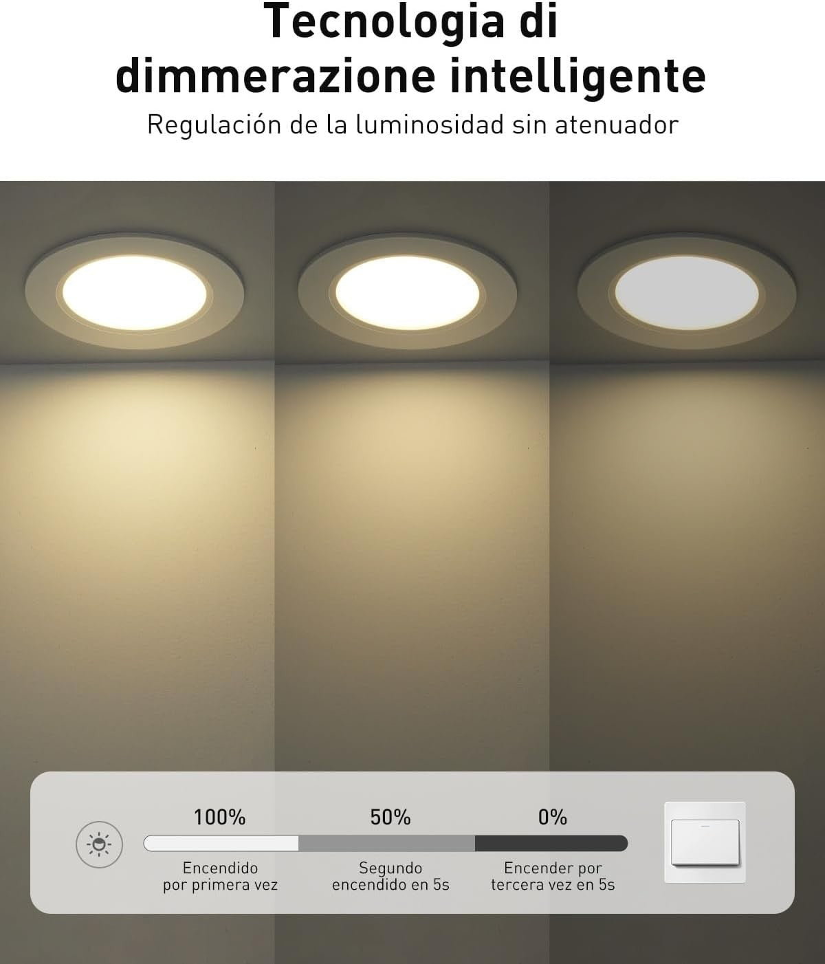 Tre livelli di luminosità: è possibile regolare facilmente tre diverse intensità di illuminazione con un semplice interruttore a parete, senza bisogno di un dimmer.100% (5W) - 50% (2,5W) - 10% (1W) Sia che si desideri una luminosità intensa per il lavoro o un'illuminazione ambientale morbida, tutto è a portata di mano. La modalità a bassa luminosità è anche più efficiente dal punto di vista energetico, consentendo di consumare meno energia e di ottenere il massimo comfort.