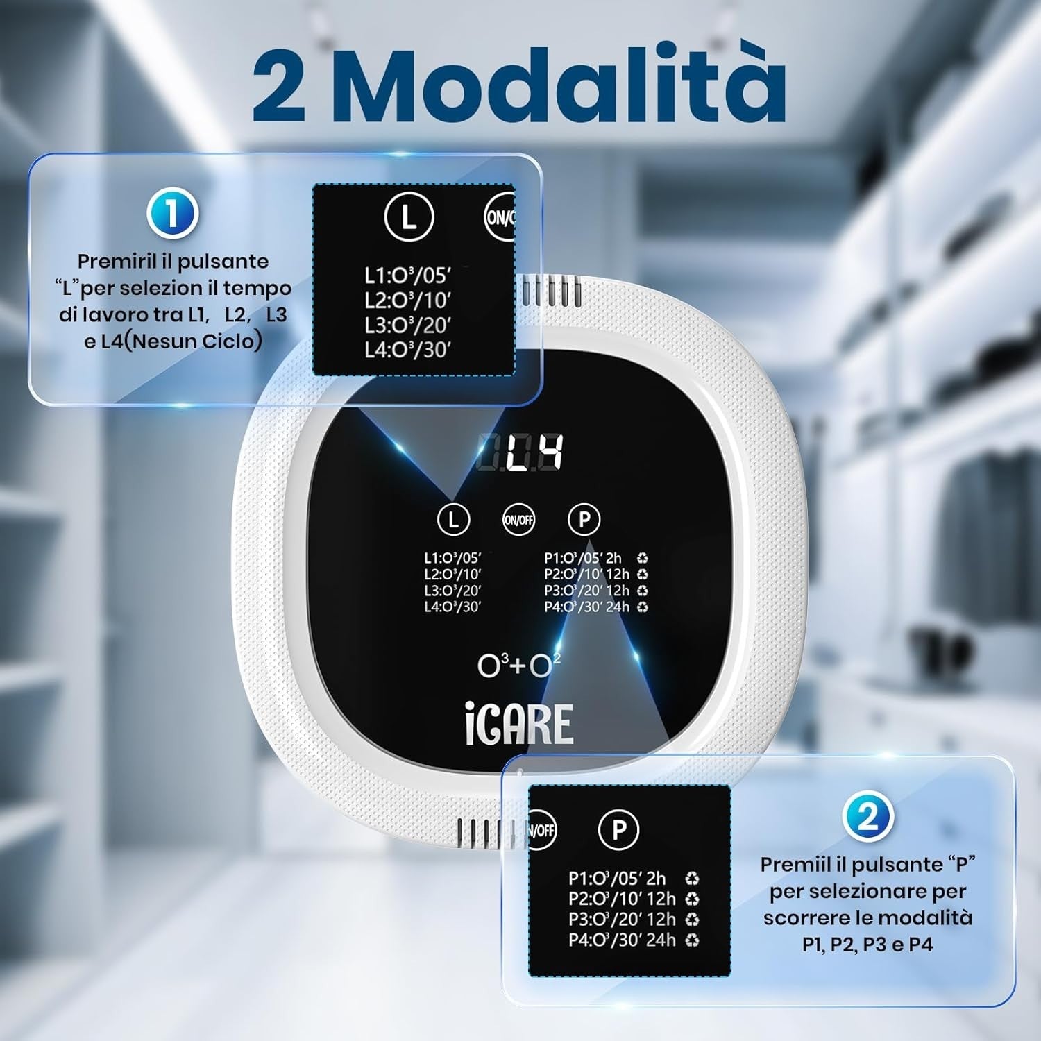 Purificatore d'aria con 2 Modalità: Quando l'apparecchio è acceso, premere il pulsante “L” per selezionare il tempo di lavoro tra L1, L2, L3 e L4 (senza ciclo), premere il pulsante “P” per passare alle modalità P1, P2, P3 e P4. Generatore di ozono è adatto per spazi di pulizia da 10-40 ㎡, a seconda della dimensione della tua stanza