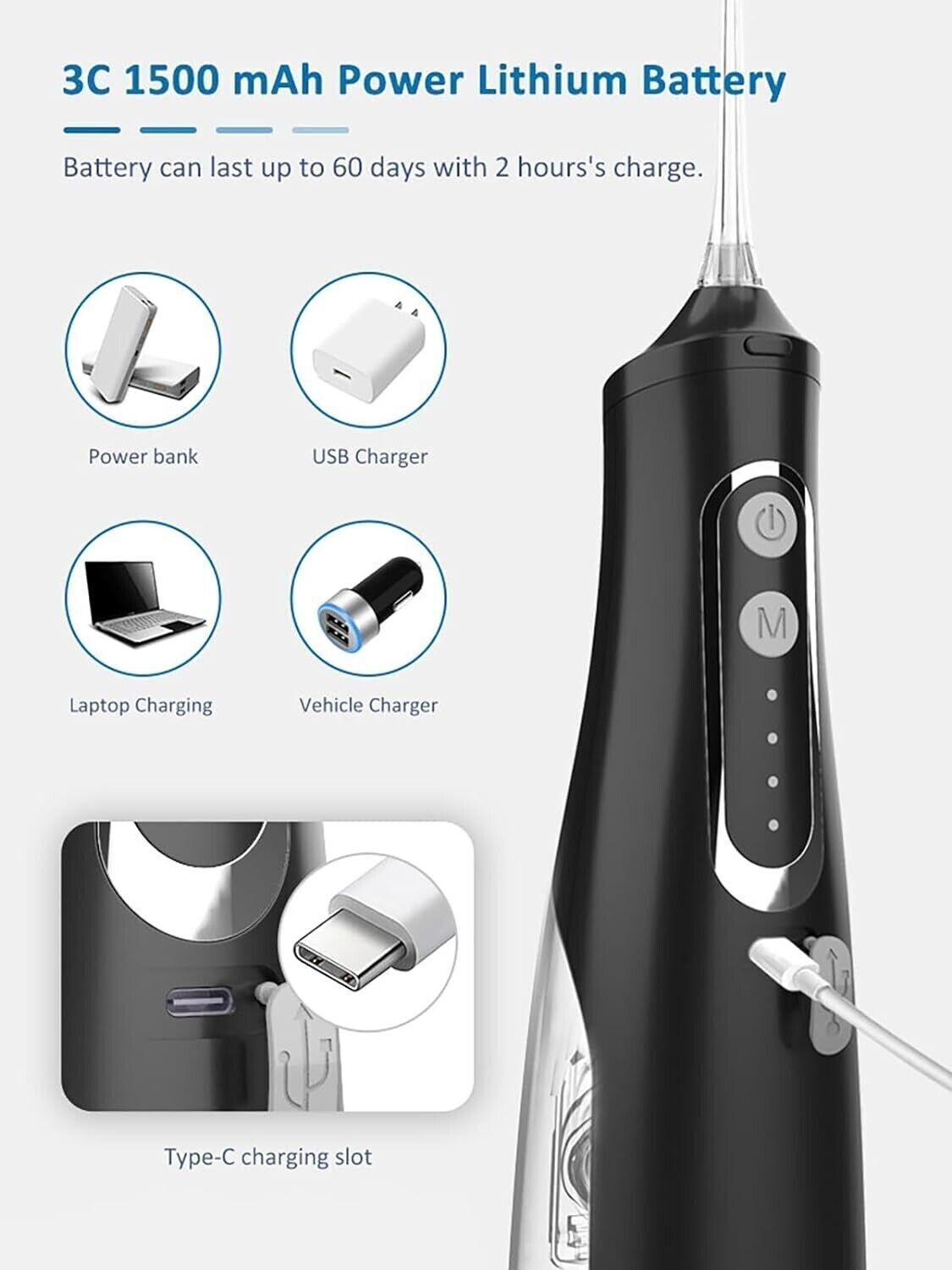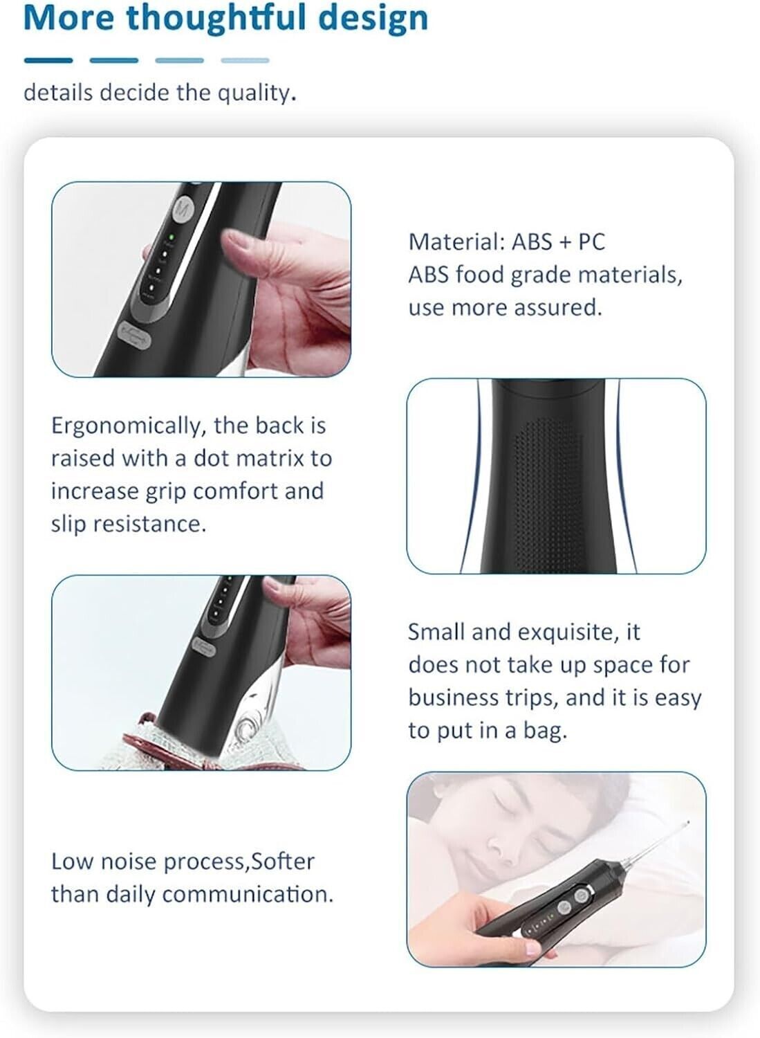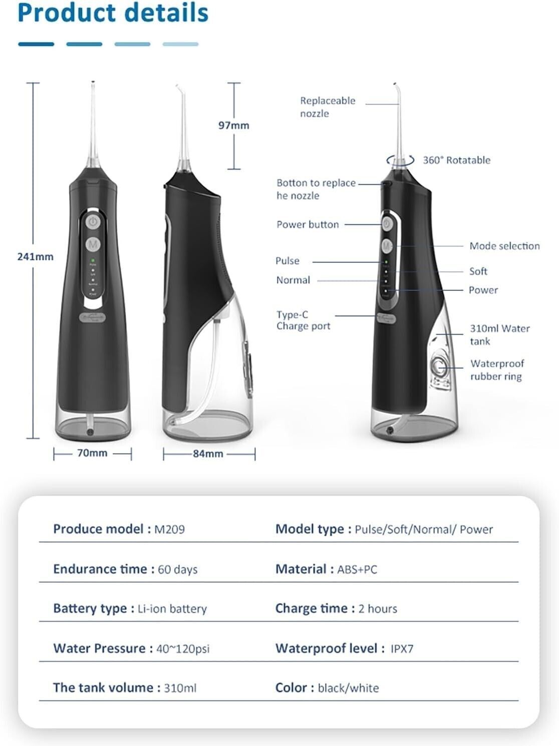 CARATTERISTICHE PRINCIPALI: 4 impostazioni di pressione for una gamma più ampia di opzioni di intensità (40-120 PSI), 4 ugelli intercambiabili (incluso un ugello raschialingua e uno spazzolino da denti), ugello girevole a 360°, tempo di lavaggio di 60 secondi, grado di impermeabilità IPX7 for utilizzo sotto la doccia, cavo USB universale e design silenzioso.