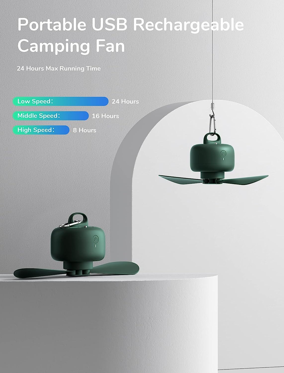 Utilizzo versatile: Questo ventilatore da campeggio USB portatile è la scelta ideale per il campeggio, la pesca, gli eventi all'aperto o un dormitorio. Con un gancio per appenderlo nella parte superiore, ti permette di appenderlo su tende, rami di alberi o ovunque tu voglia. È un vero toccasana per i giorni di campeggio o durante la stagione degli uragani e altre interruzioni di emergenza.