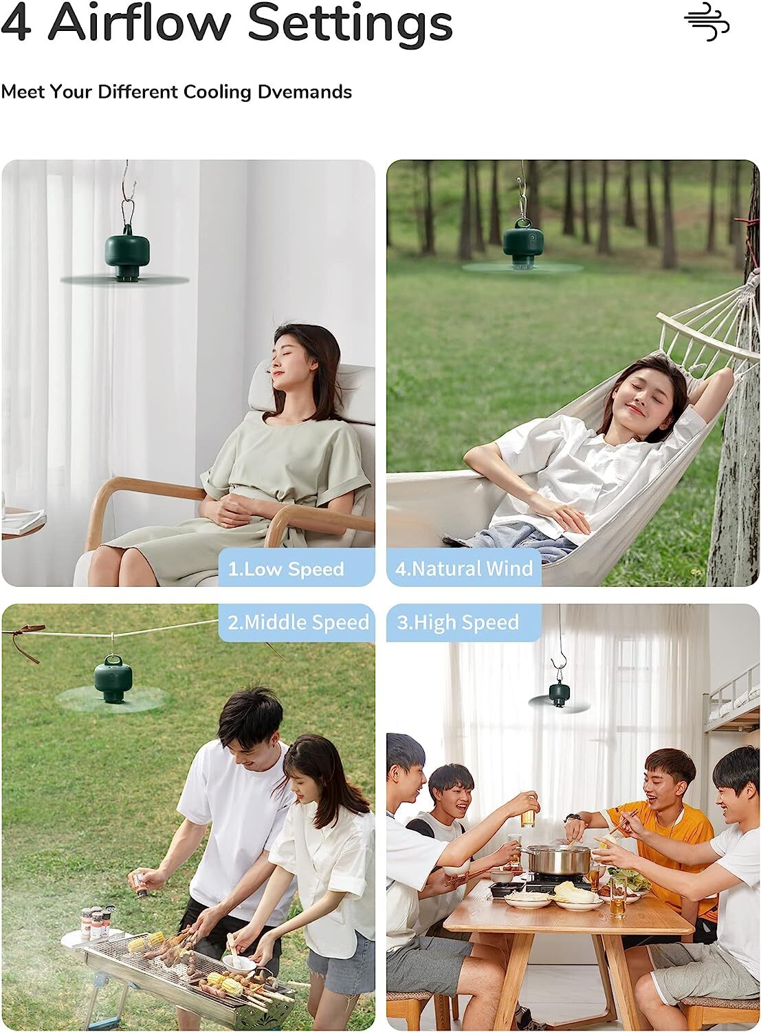 4 marce per la velocità del vento: Sono disponibili 4 marce per la velocità del vento per soddisfare le diverse esigenze di raffreddamento nelle giornate e nelle notti calde. (Basso-Medio-Alto-Vento naturale). Questo ventilatore da campeggio USB continua a funzionare per 25/16/8,5 ore con velocità del vento 1/2/3.