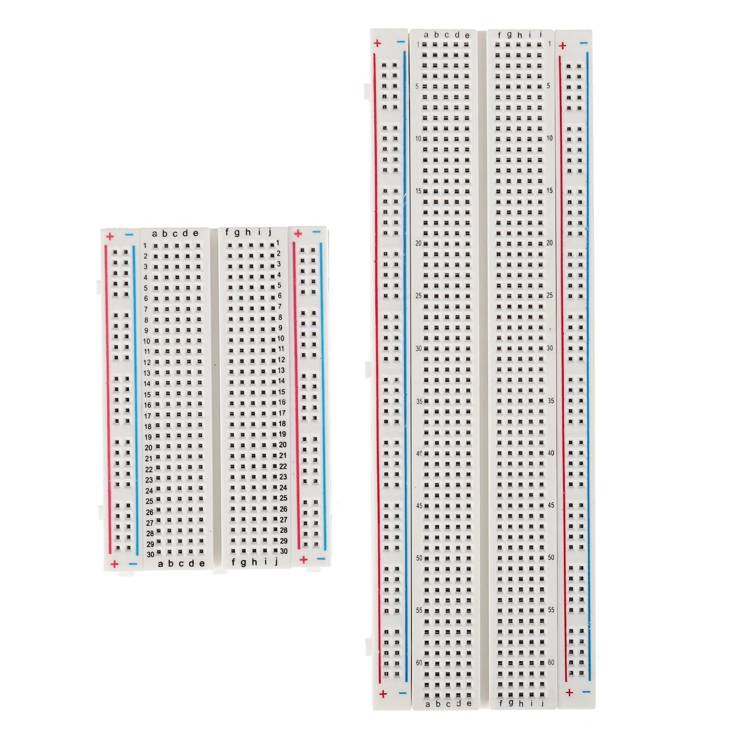 La confezione include 1 tagliere con 830 punti di fissaggio, 1 tagliere con 400 punti di fissaggio, 6 mini breadboard da 170 punti di collegamento e 65 cavi flessibili per breadboard. (73 pezzi in totale)