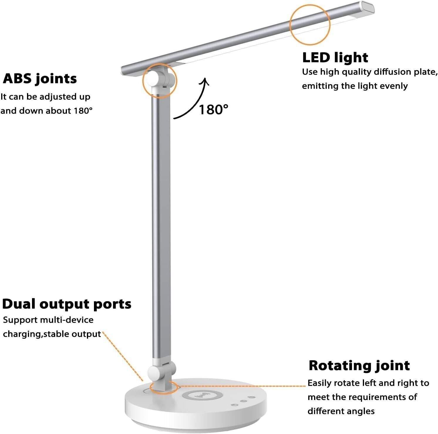 Lampada da scrivania touch completamente dimmerabile: dopo aver letto il feedback di molti clienti, abbiamo aggiornato questa lampada da scrivania con la funzione di oscuramento completo e 5 modalità colore, attenuando gradualmente la luminosità dallo 0 al 100%. Progettata con controllo touch, semplifica l'impostazione della luminosità. livello di luminosità semplicemente facendo scorrere leggermente il touch pad.