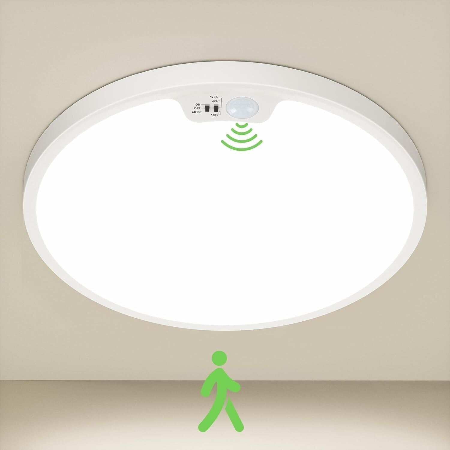 Lampada a LED con rilevatore di movimento: Questa lampada da soffitto con rilevatore di movimento si accende immediatamente quando rileva un movimento a 3,5 m di distanza e mantiene l'illuminazione accesa per periodi stabiliti (30 s/120 s/180 s); Ciò significa che non dovrai cercare interruttori da parete al buio di notte o preoccuparti degli angoli in condizioni di scarsa illuminazione.
