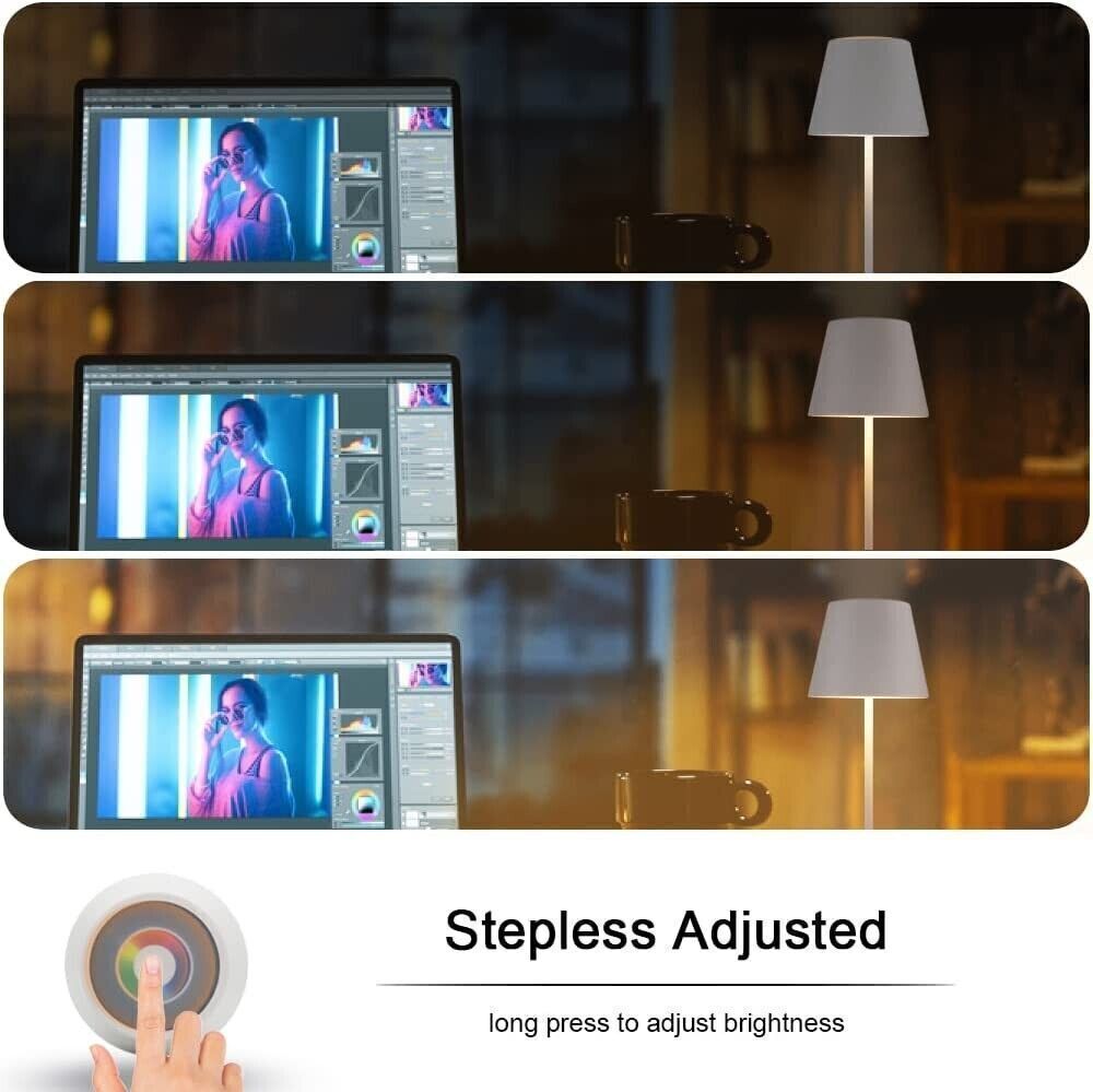 RICARICABILE: Tasto lungo per regolare la luminosità della luce. La lampada da tavolo può essere facilmente caricata con l'alimentatore USB incluso. Si illumina in modalità wireless per 9 ore a piena luminosità e fino a 24 ore in modalità dimmer.