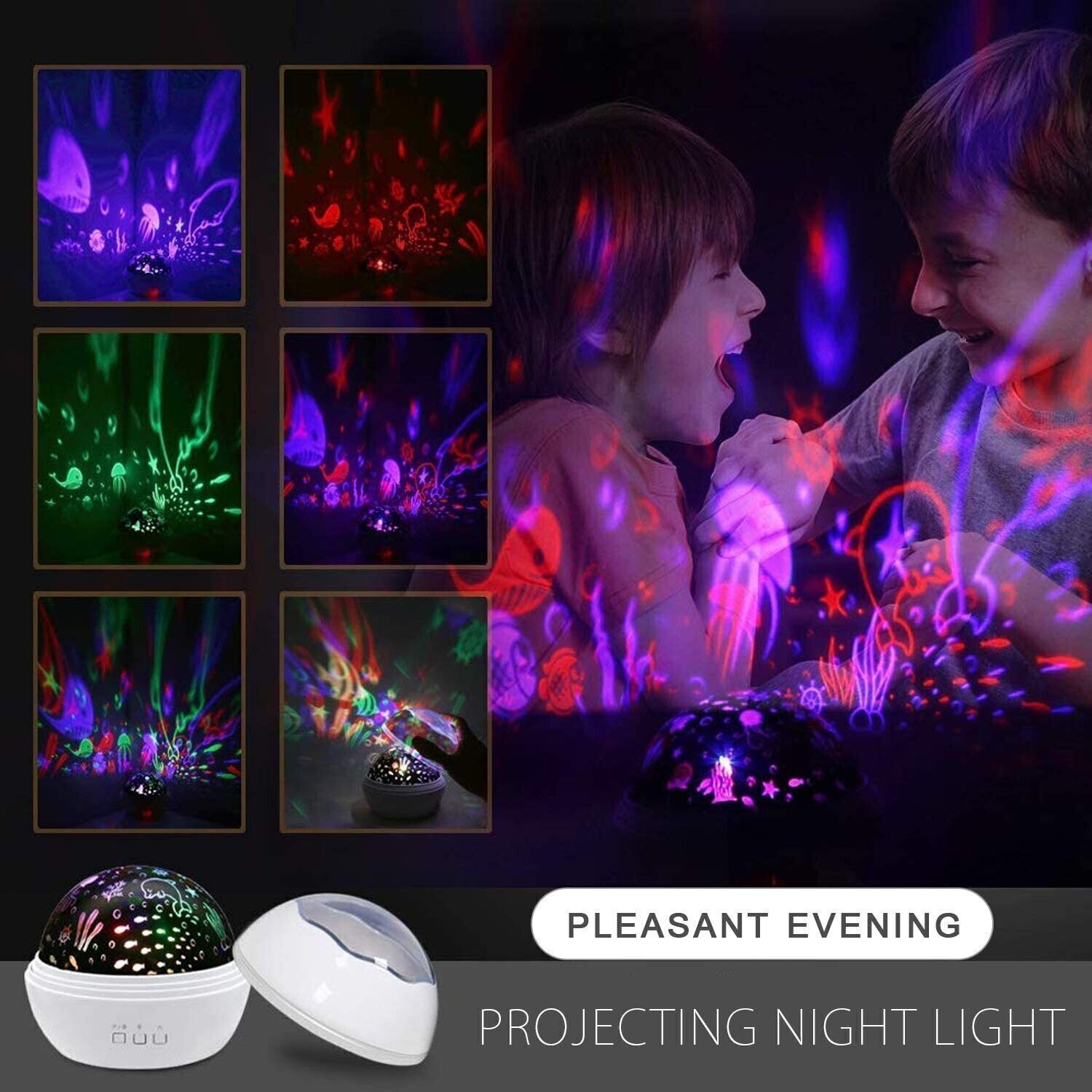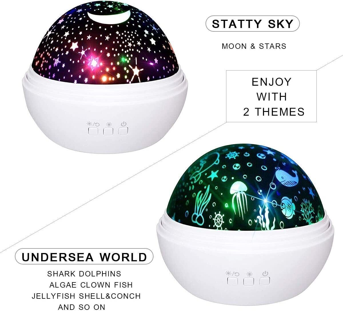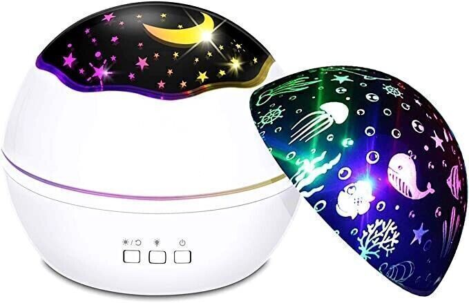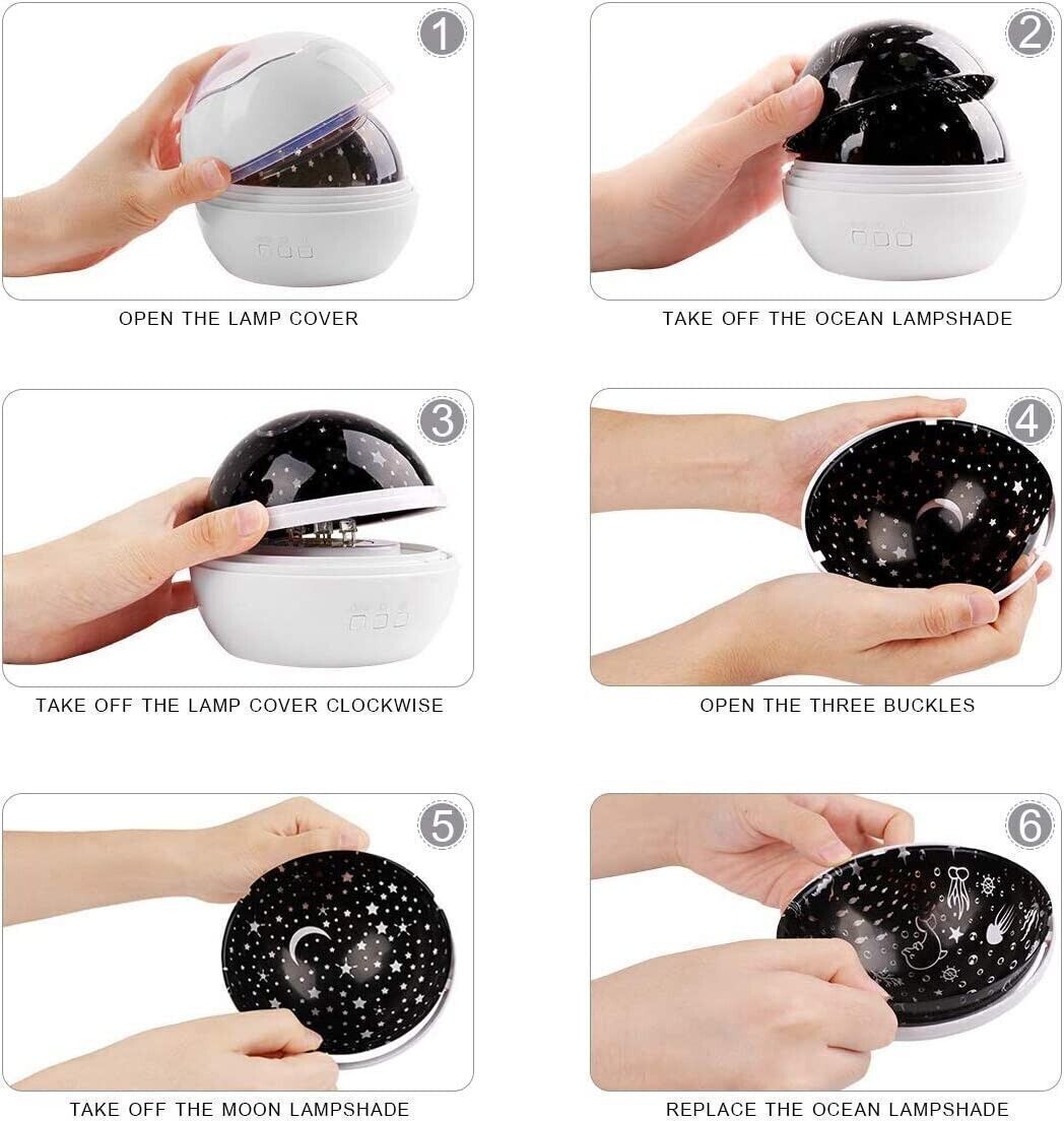Proiettore stella/luce notturna. Costruito con la cupola bianca rimovibile, è possibile utilizzarlo come luce notturna (basta estrarre la pellicola di proiezione) o un romantico spettacolo di proiezione del cielo stellato/vita dell'oceano. Si tratta di un grande proiettore che risveglia l'interesse dei bambini nel mondo ed è anche una buona luce notturna per un'esperienza di sonno piacevole e rilassante per i bambini.