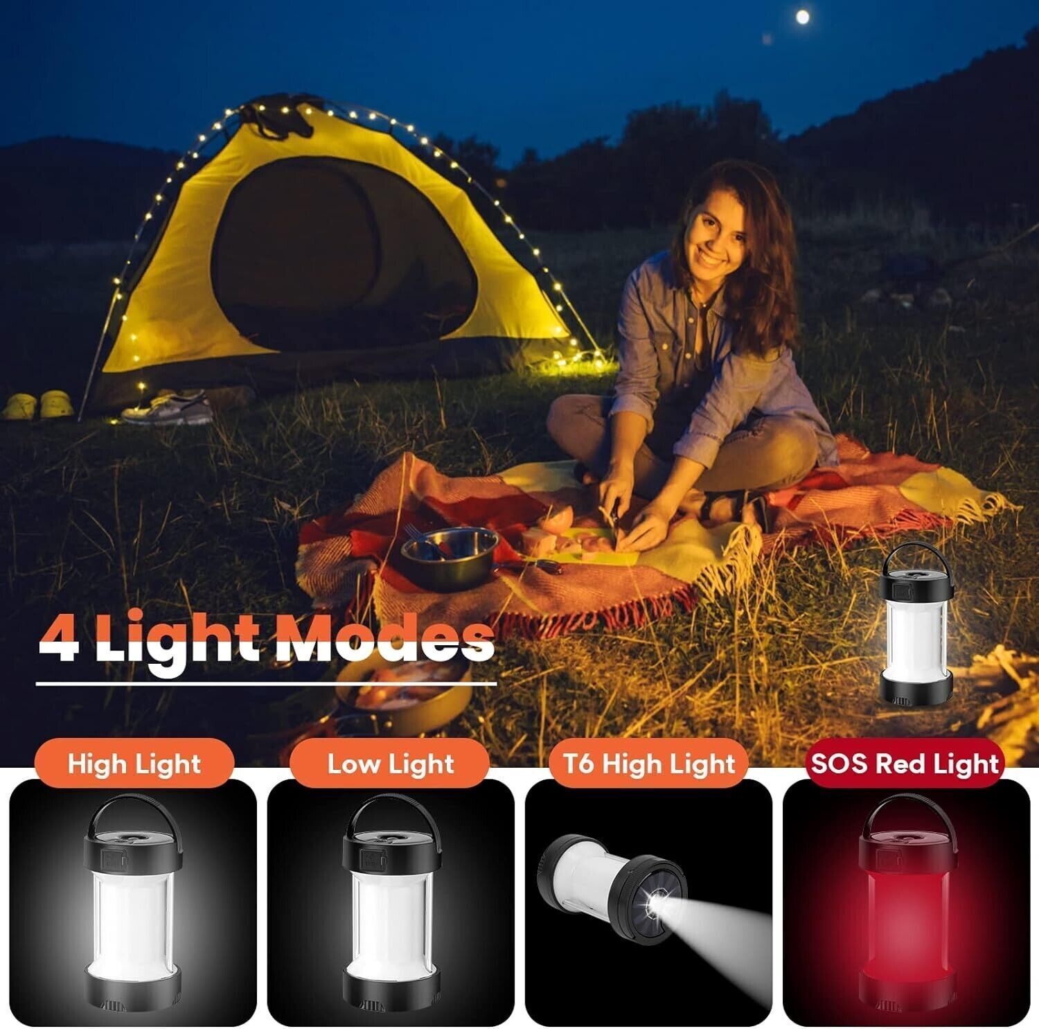 4 modalità di illuminazione: la lampada da campeggio ha quattro modalità di illuminazione che possono essere selezionate in base alle proprie esigenze. Puoi scegliere tra luce bianca calda, luce bianca fredda, luce bianca forte e luce rossa lampeggiante. Il primo livello per luce LED forte (1000 lumen), il secondo livello per luce LED debole (200 lumen), il terzo livello per luce forte T6 (300 lumen), il quarto livello per luce rossa SOS (200 lumen) cambia con un basta un clic per soddisfare pienamente le tue esigenze.