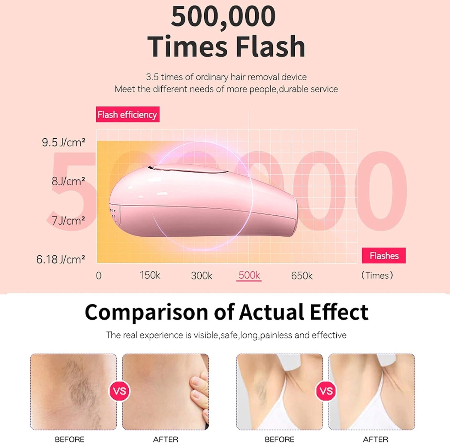 FLASH DI LUNGA DURATA.Il nostro epilatore IPL è dotato di un fantastico flash al quarzo che ti garantirà diversi anni di utilizzo. L'IPL è ben progettato pensando alla sicurezza e all'efficacia per evitare danni alla pelle. Produce un impulso potente che viene assorbito dal follicolo pilifero; dopo l'assorbimento, il follicolo inizia a restringersi e impedisce la crescita dei peli, ottenendo l'effetto di una depilazione permanente.