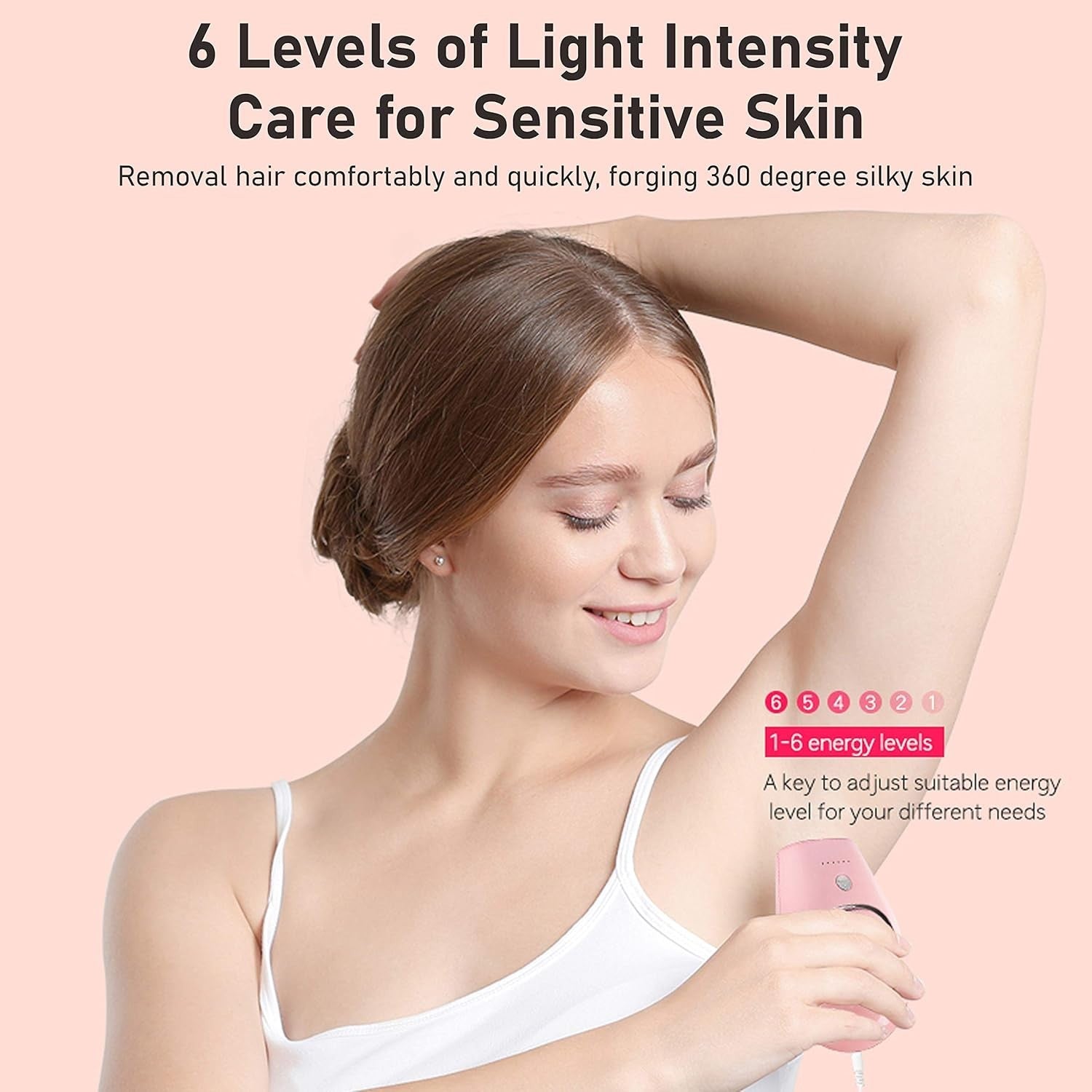 DUE MODALITÀ FLASH E SEI LIVELLI DI INTENSITÀ.Questo dispositivo è dotato di modalità flash manuale e automatica e sei livelli di intensità, progettati per soddisfare le esigenze di cura della pelle. La modalità manuale è utilizzata per aree di precisione, come inguine, ascelle, mento, viso, collo, peli del labbro superiore e dita, mentre la modalità automatica può essere utilizzata per aree più ampie, come schiena, gambe, braccia e addome.
