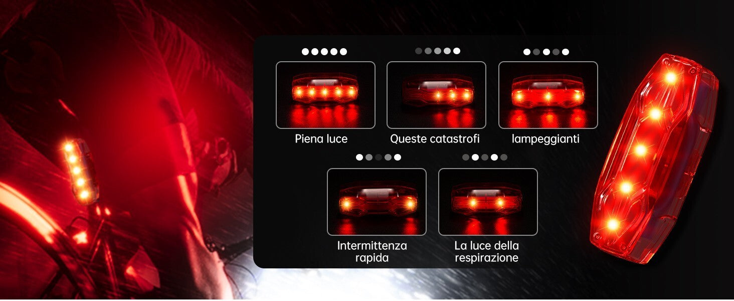 Cosa Riceverete: *1, luce bici anteriore *1, luce posteriore bici *1, staffa in alluminio *2, tappetino antiscivolo in silicone *2, cavo di ricarica USB *1, manuale di istruzioni *2