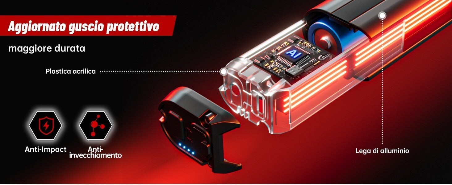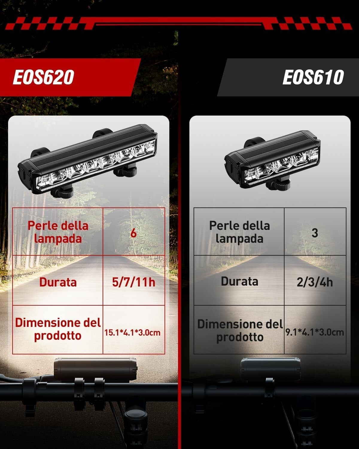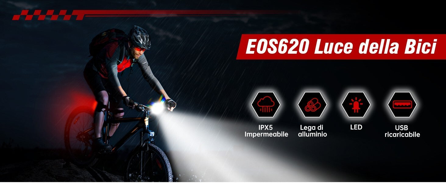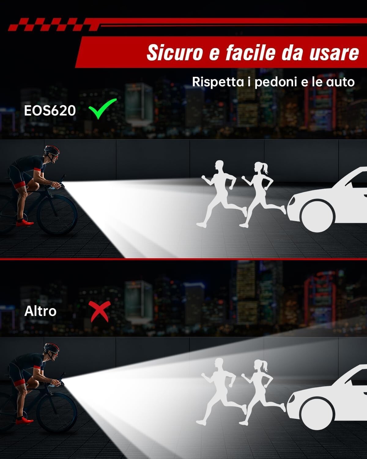 Alloggiamento in Alluminio & Impermeabilità IPX5: Il materiale dell'alloggiamento è realizzato in lega di alluminio ad alta resistenza, l'interno è rinforzato con acrilico, ogni luce bici potente EOS620 è stata testata migliaia di volte per la stabilità e il test della luce per garantire la robustezza e la stabilità della fanali bici, il grado di impermeabilità è IPX5, si può essere certi di utilizzarla quando piove o nevica.