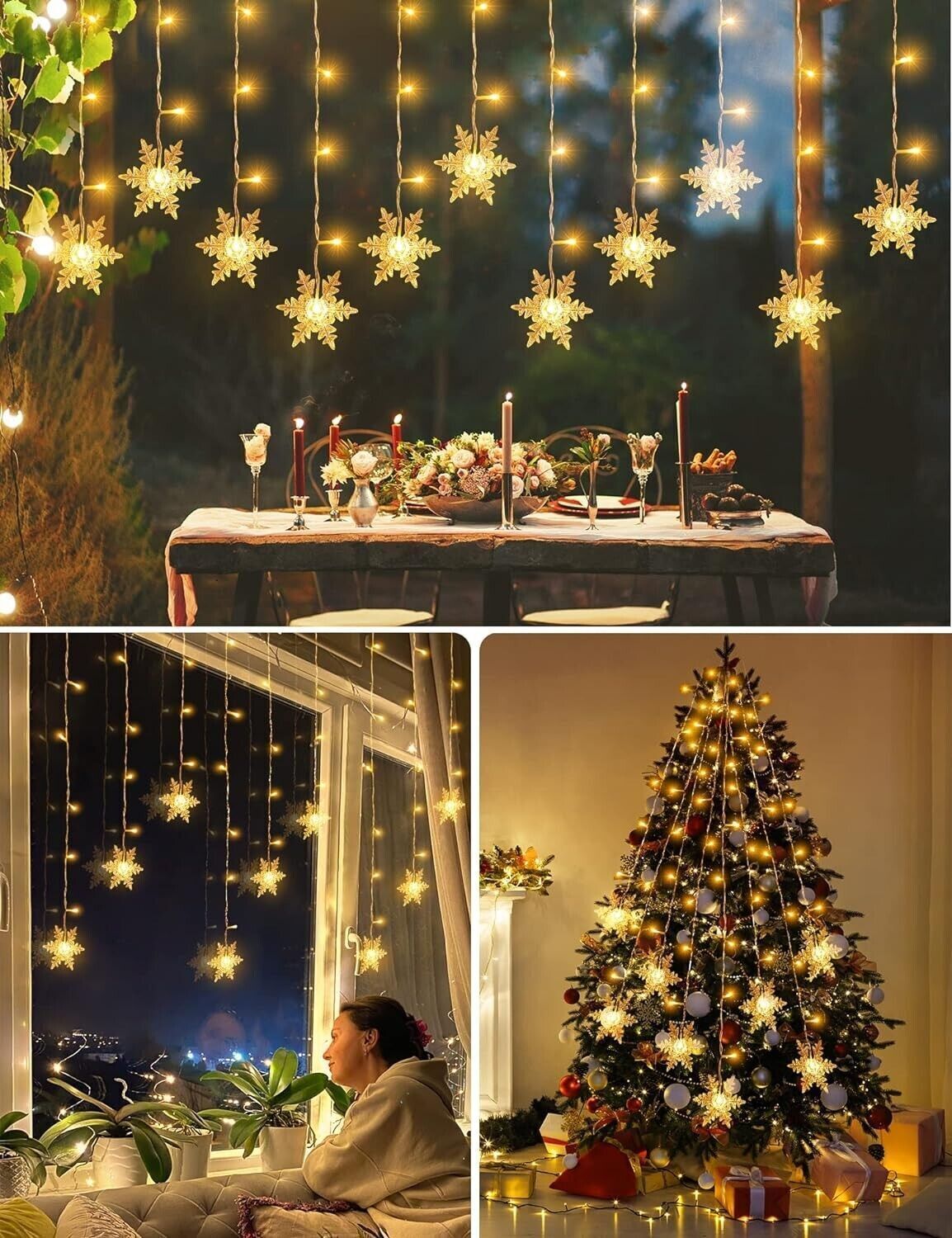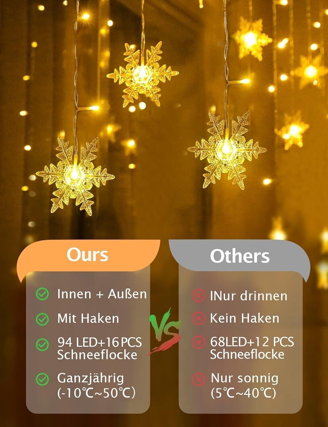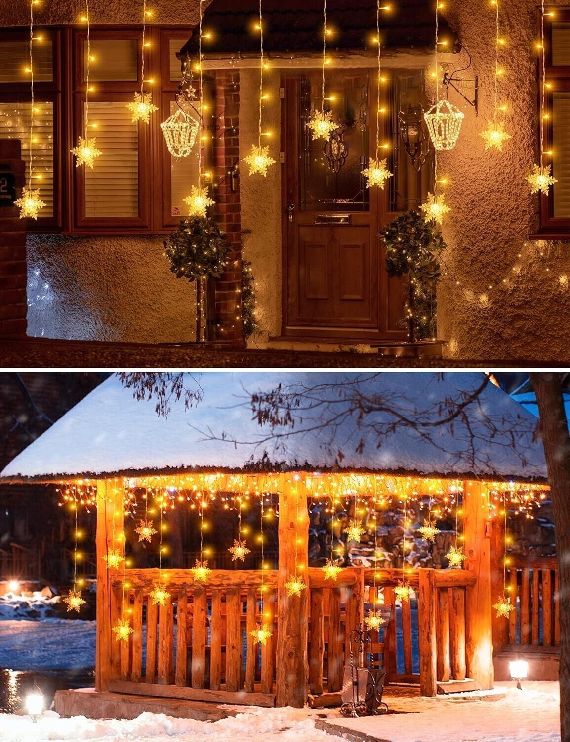 Specifiche: Tenda Luci LED ha 94 LED e 16 luci per la neve. La distanza tra le sfere luminose a LED e ciascuna linea luminosa è di 12 cm e su ciascuna stringa luminosa è presente una luce a fiocco di neve. La luce calda e morbida crea un'atmosfera calda e romantica, aggiungendo un tocco di calore alle notti invernali!