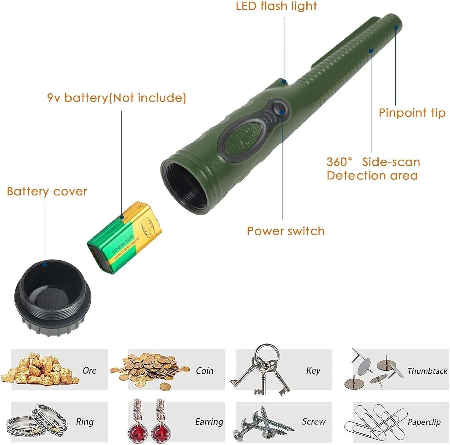 Ampiamente usato: il rilevatore di metalli può aiutarti a ottenere un posizionamento preciso su piccola scala che i rilevatori di metalli di grandi dimensioni non possono fare. Il rilevatore di metalli per bambini era perfetto per Natale, i rilevatori di metalli pinpoint per adulti possono funzionare all'aperto, al chiuso, sulla sabbia, sul prato o nel terreno, individuare monete, argento, gioielli e oro con velocità e precisione.