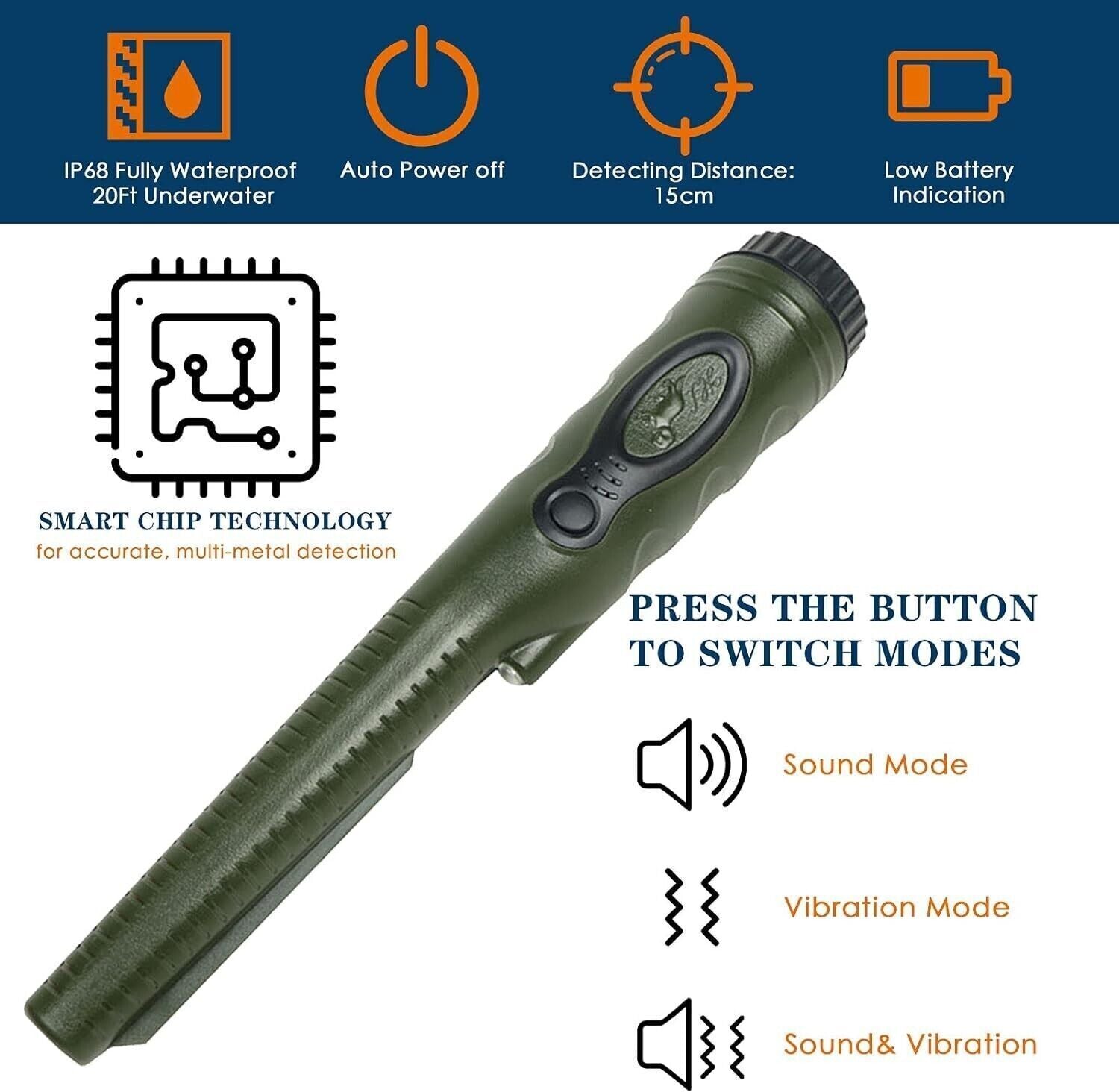 Tre modalità: metal detector progettato per realizzare la conversione tra tre modalità: modalità vibrazione (silenzioso), modalità audio, vibrazione e modalità audio. Ci sono tre livelli di sensibilità con audio diverso e avviso con vibrazione alla diversa distanza tra sensore e oggetto.