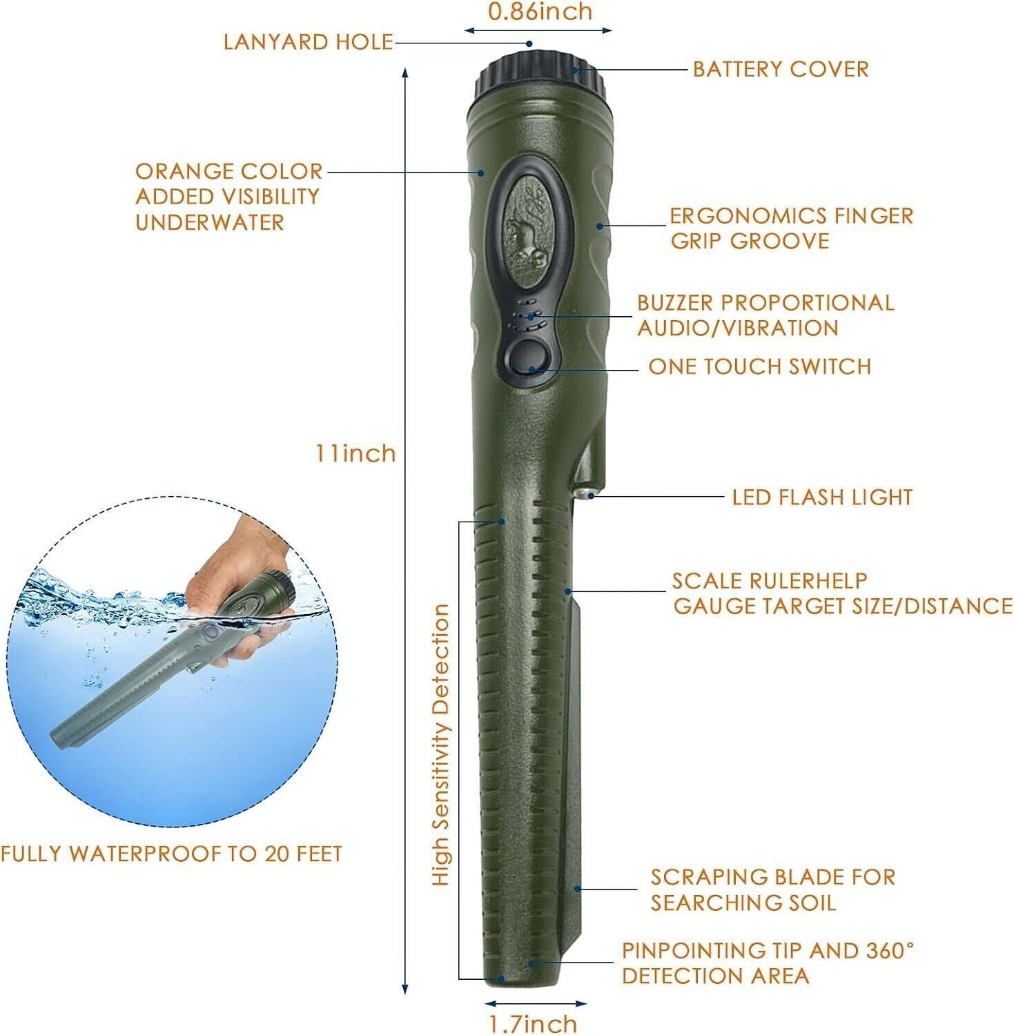 Completamente impermeabile: la maggior parte dei metal detector portatili solo parzialmente impermeabile o a prova di schizzi. Questo rilevatore migliorato è classificato IP68, l'intero corpo può essere immerso in 20 piedi sott'acqua. I metal detector impermeabili per adulti possono cacciare al tesoro sott'acqua per 48 ore e più.