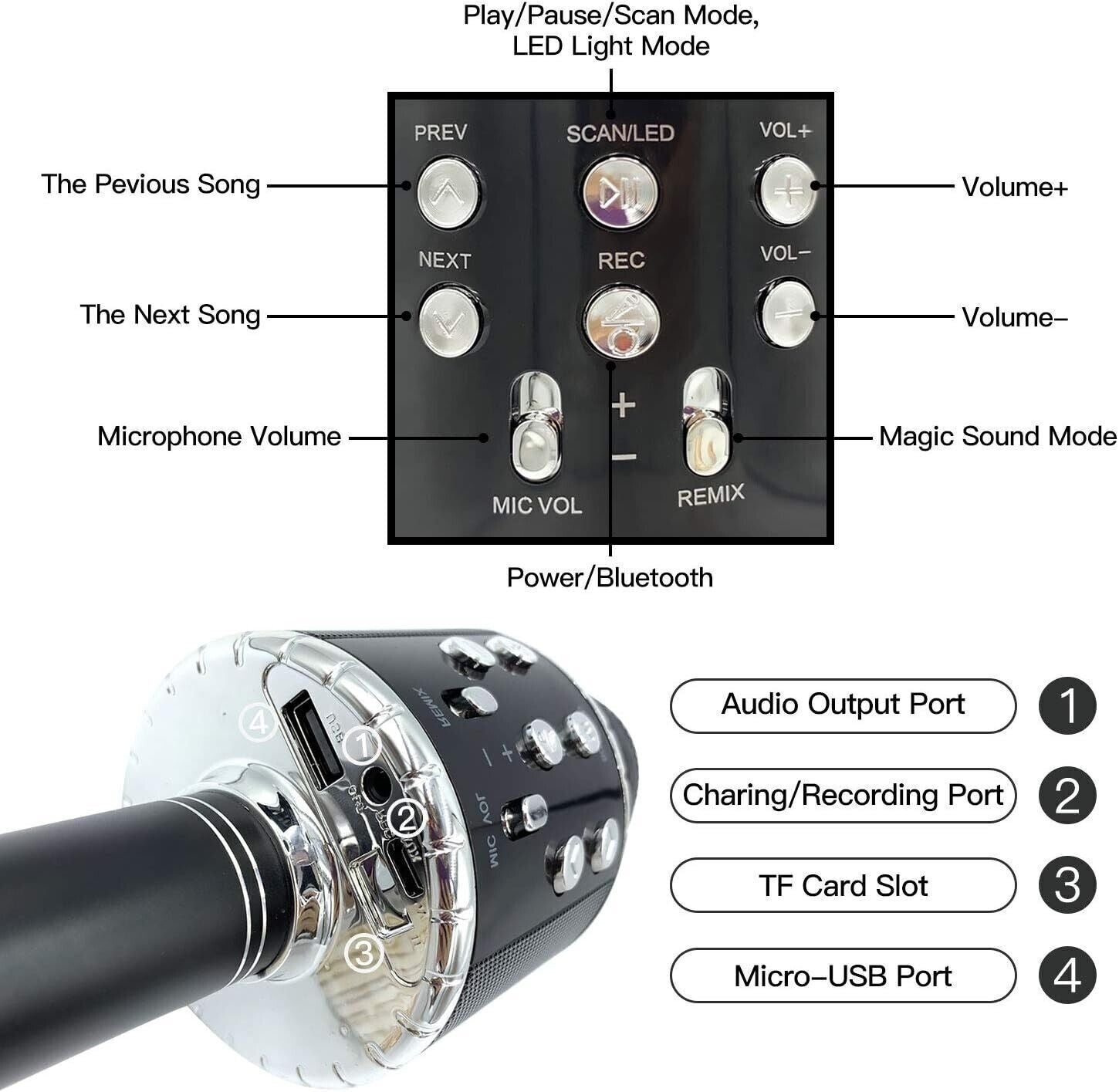 Tempo di gioco lungo: Batteria ricaricabile integrata agli ioni di litio da 1800 mAh, questo microfono wireless per karaoke Bluetooth può durare 5-6 ore dopo una ricarica completa.