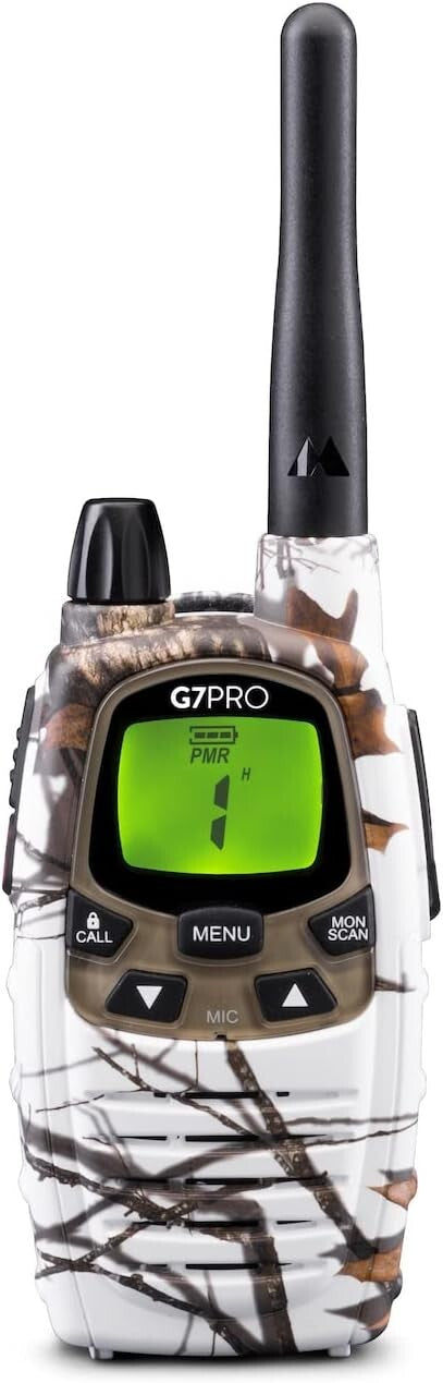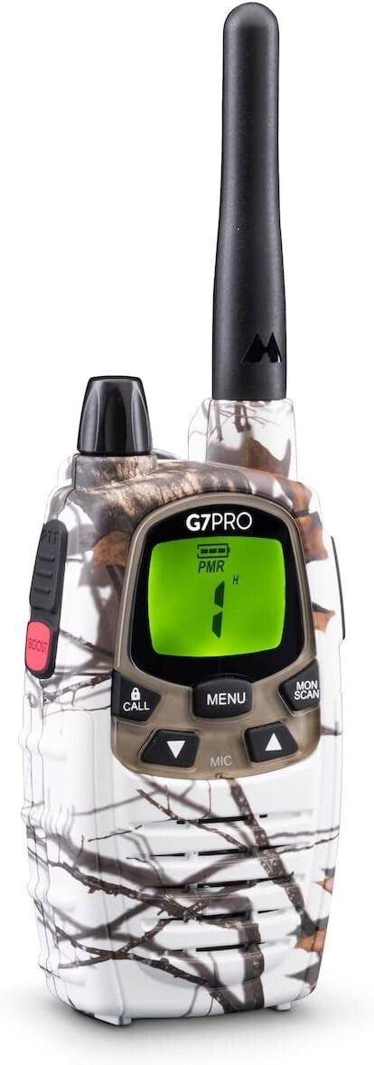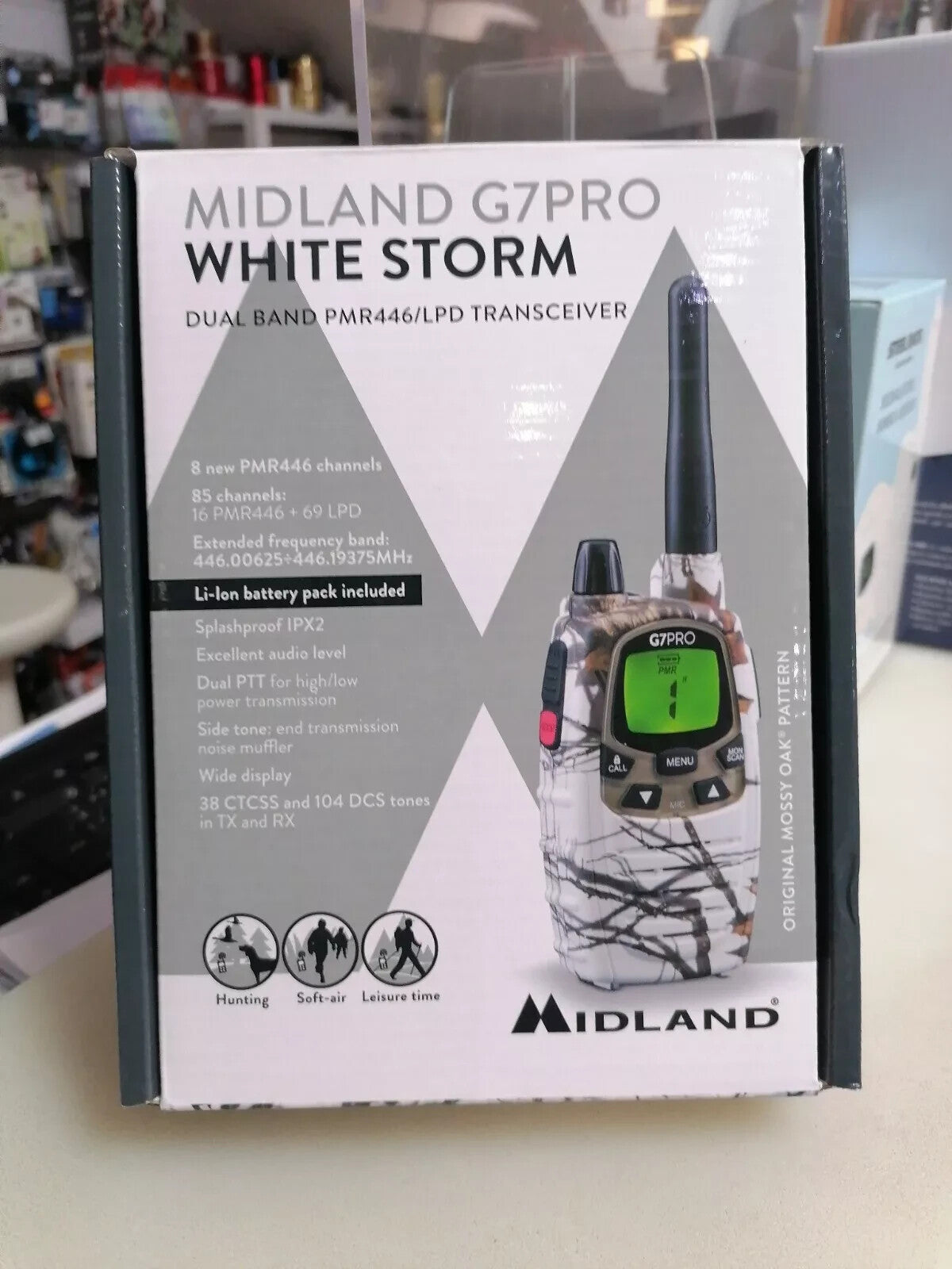 Midland G7 Pro White Storm è la radio trasmittente per te che ami le attività all'aria aperta, con antenna potente, doppio tasto PTT per regolare alta e bassa potenza, certificazione impermeabile IPX4 adatta per escursionismo, softair e caccia