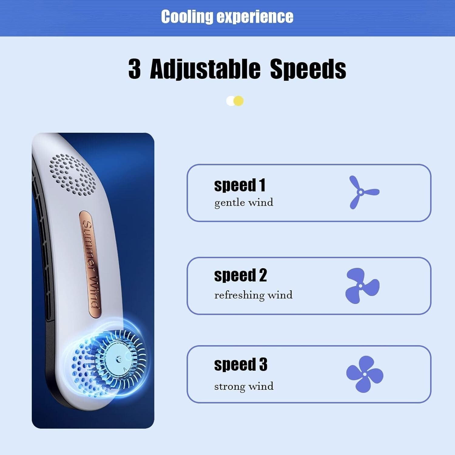 3 velocità regolabili: vento delicato e rinfrescante, vento forte.