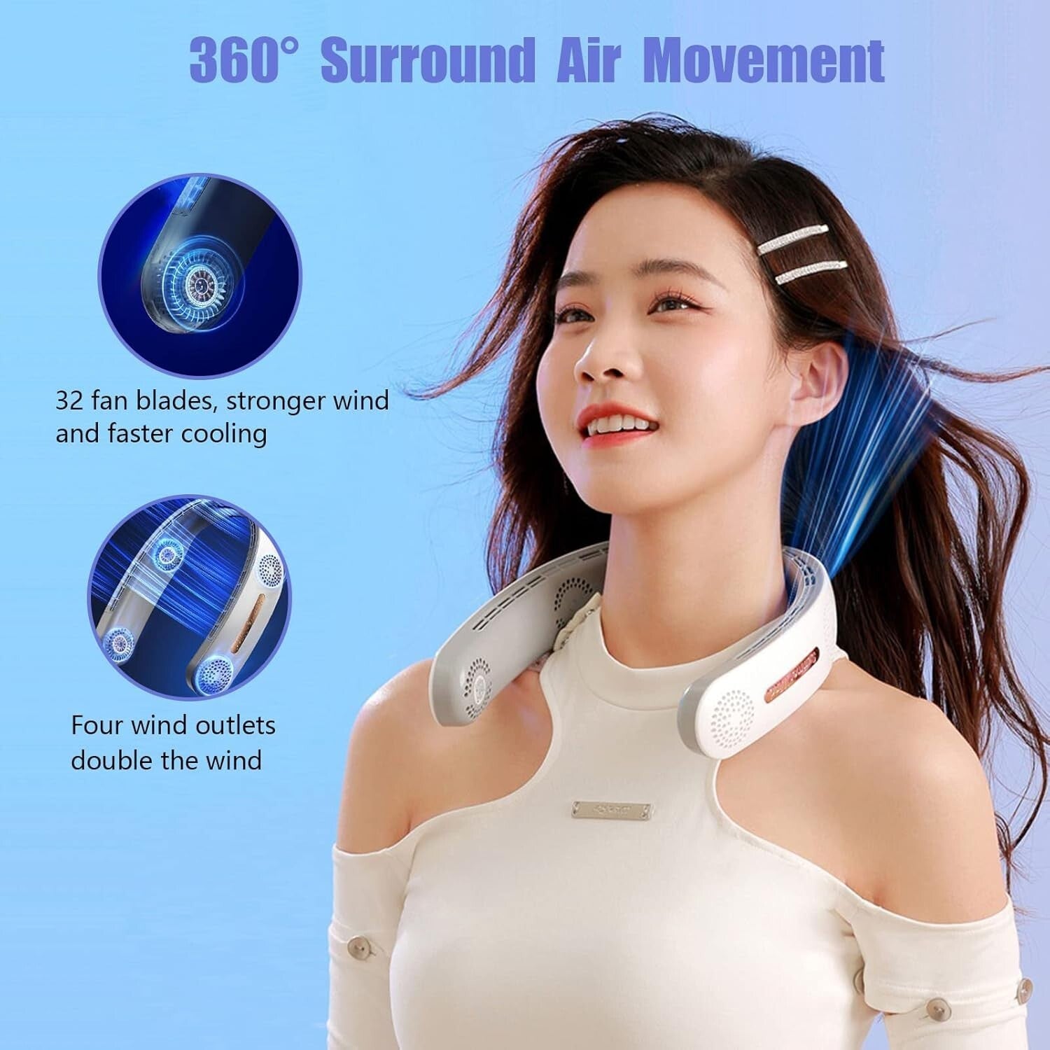 3 velocità regolabili: il ventilatore da collo ha 3 marce di basso/medio/alto tra cui scegliere, funzionamento con un solo pulsante, semplice e veloce. Il movimento dell'aria a 360° ti mantiene fresco in ogni momento.