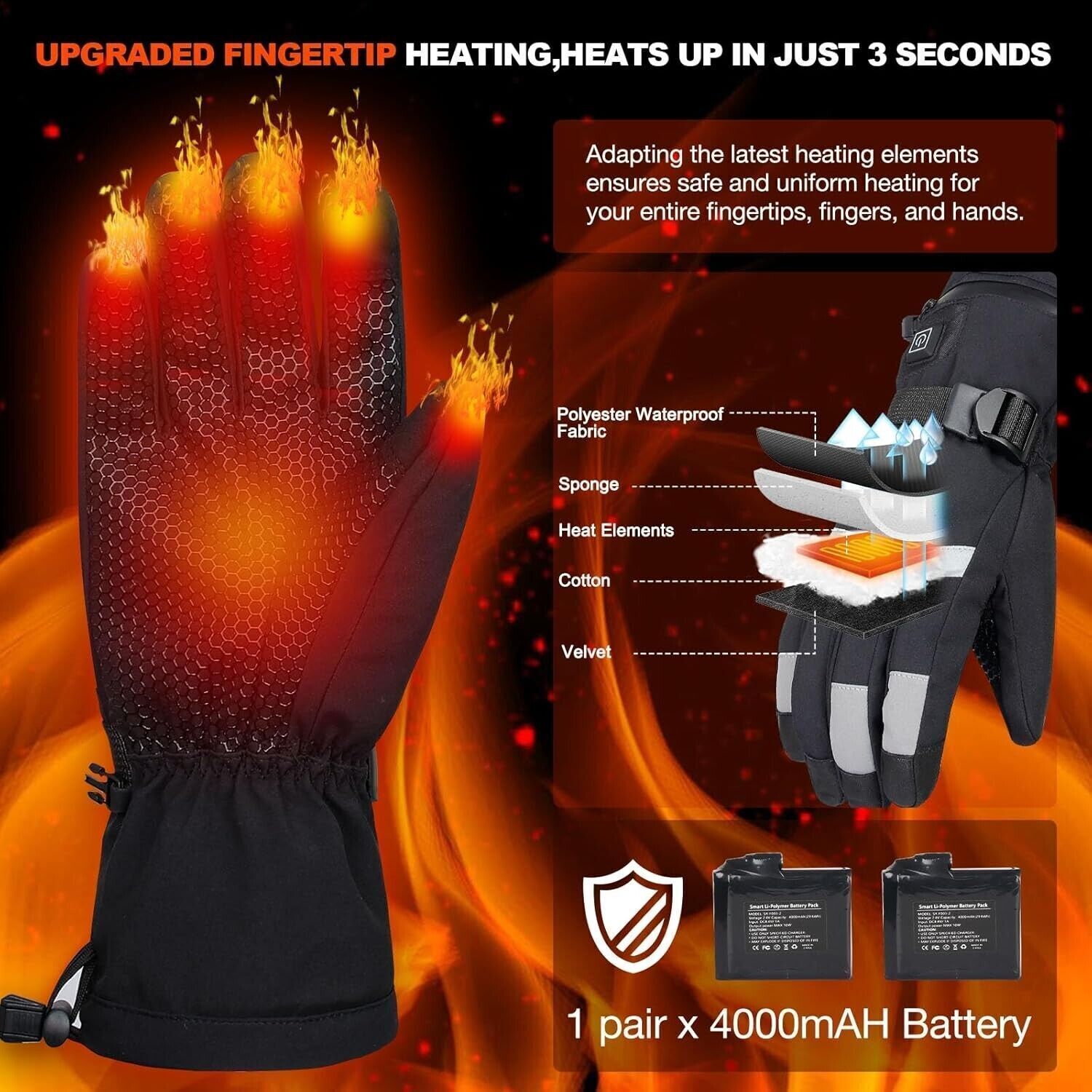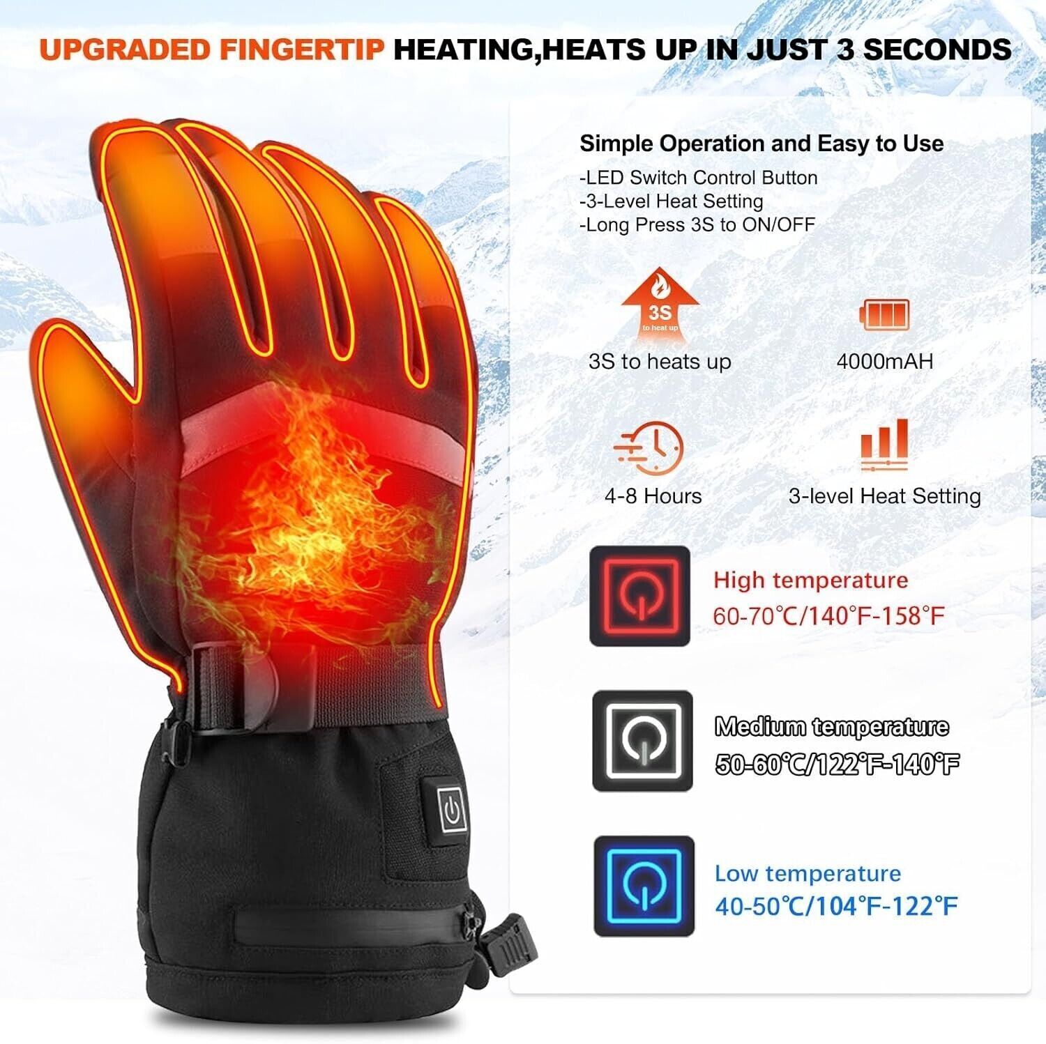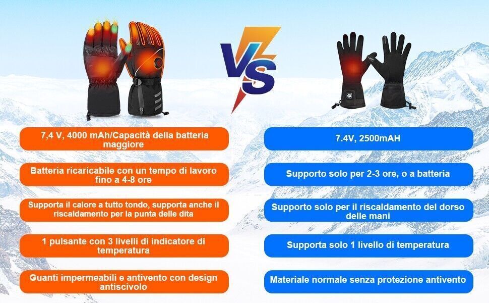 Elettrici Guanti riscaldati per un calore a tutto tondo.I guanti riscaldati invernali di Moteoza non solo riscaldano regolarmente la mano, ma supportano anche il riscaldamento dell'intero dito fino al polpastrello. Si riscaldano molto rapidamente e possono rimanere riscaldati per 4-8 ore, per tenervi al caldo tutto il giorno. 4000mAh 7.4V, incluse 1 coppia di batterie ricaricabili e doppio caricatore standard.