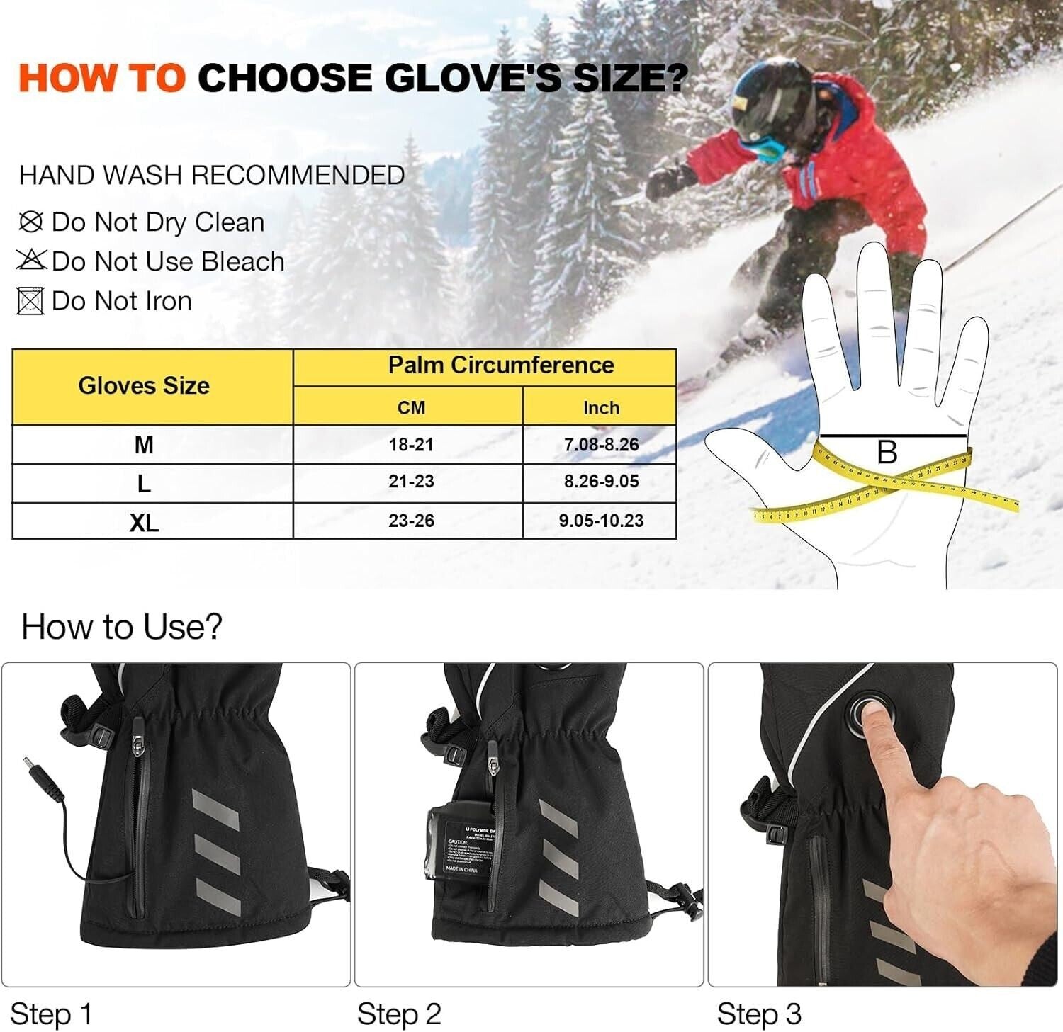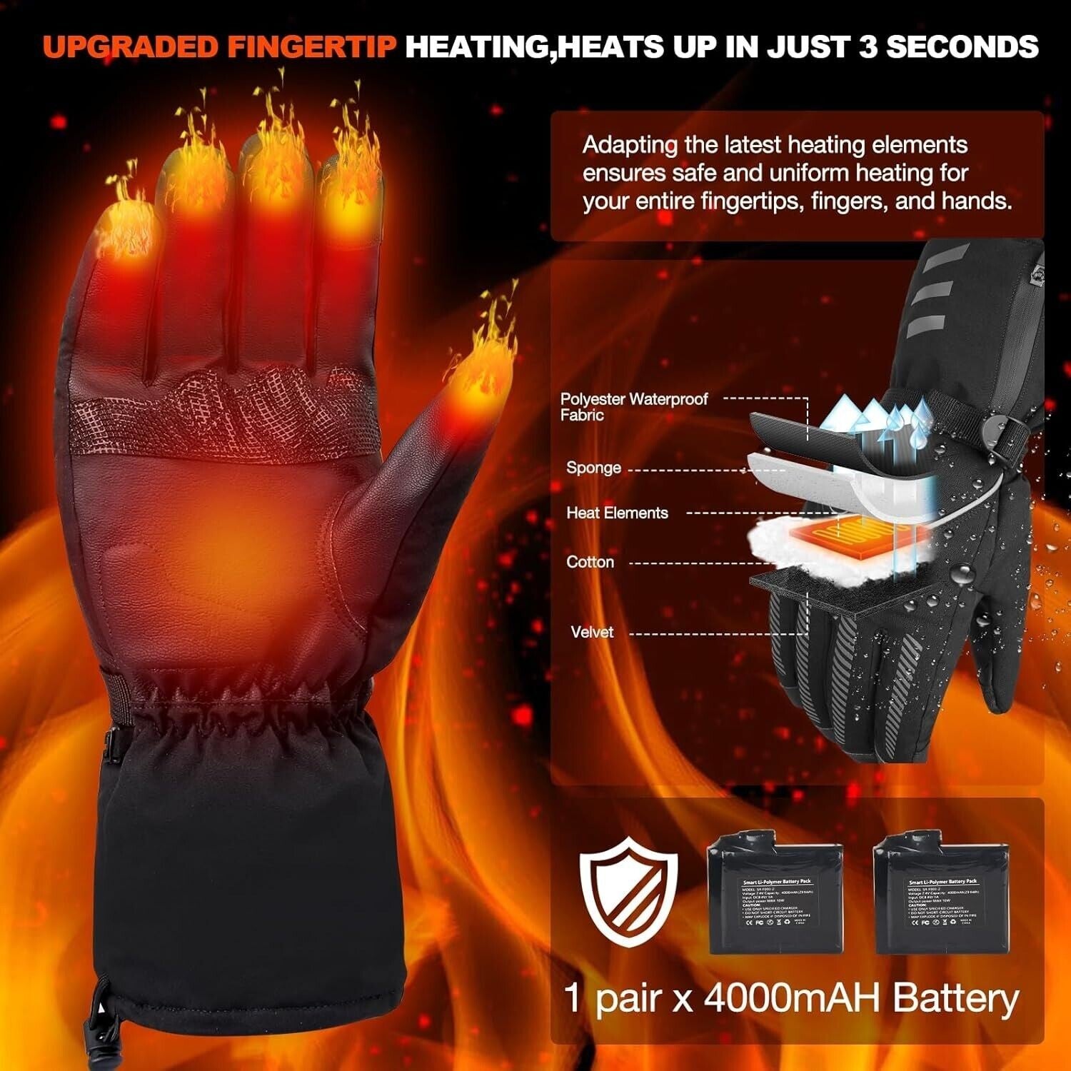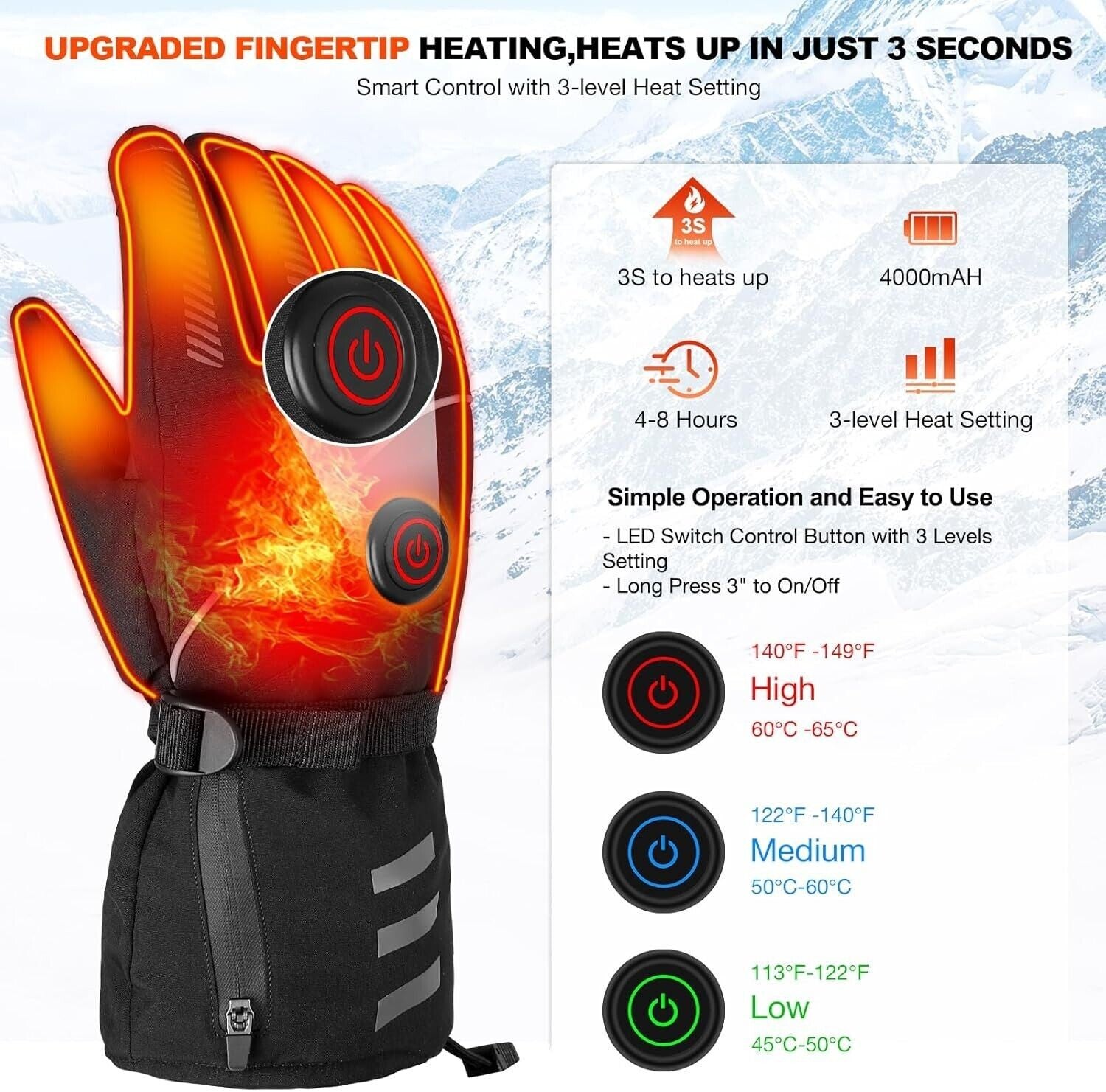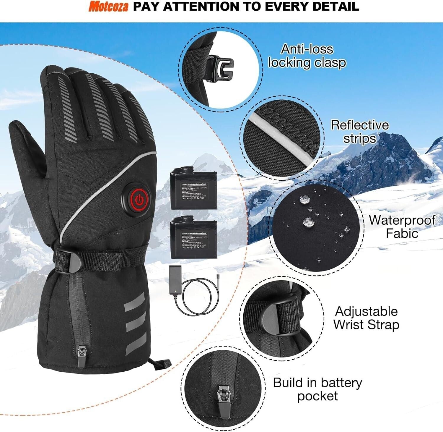 Elettrici Guanti riscaldati per un calore a tutto tondo.I guanti riscaldati invernali di Moteoza non solo riscaldano regolarmente la mano, ma supportano anche il riscaldamento dell'intero dito fino al polpastrello. Si riscaldano molto rapidamente e possono rimanere riscaldati per 4-8 ore, per tenervi al caldo tutto il giorno. 4000mAh 7.4V, incluse 1 coppia di batterie ricaricabili e doppio caricatore standard.