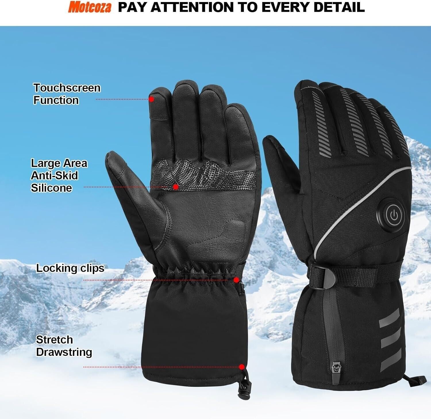 Moteoza Elettrici Guanti riscaldati Foderato con batteria Ricaricabile Invernali All'aperto Scaldamani, 3 Livelli di Calore Guanti Termici Impermeabili Guanti Caldi Touch Screen, Guanti sci moto.