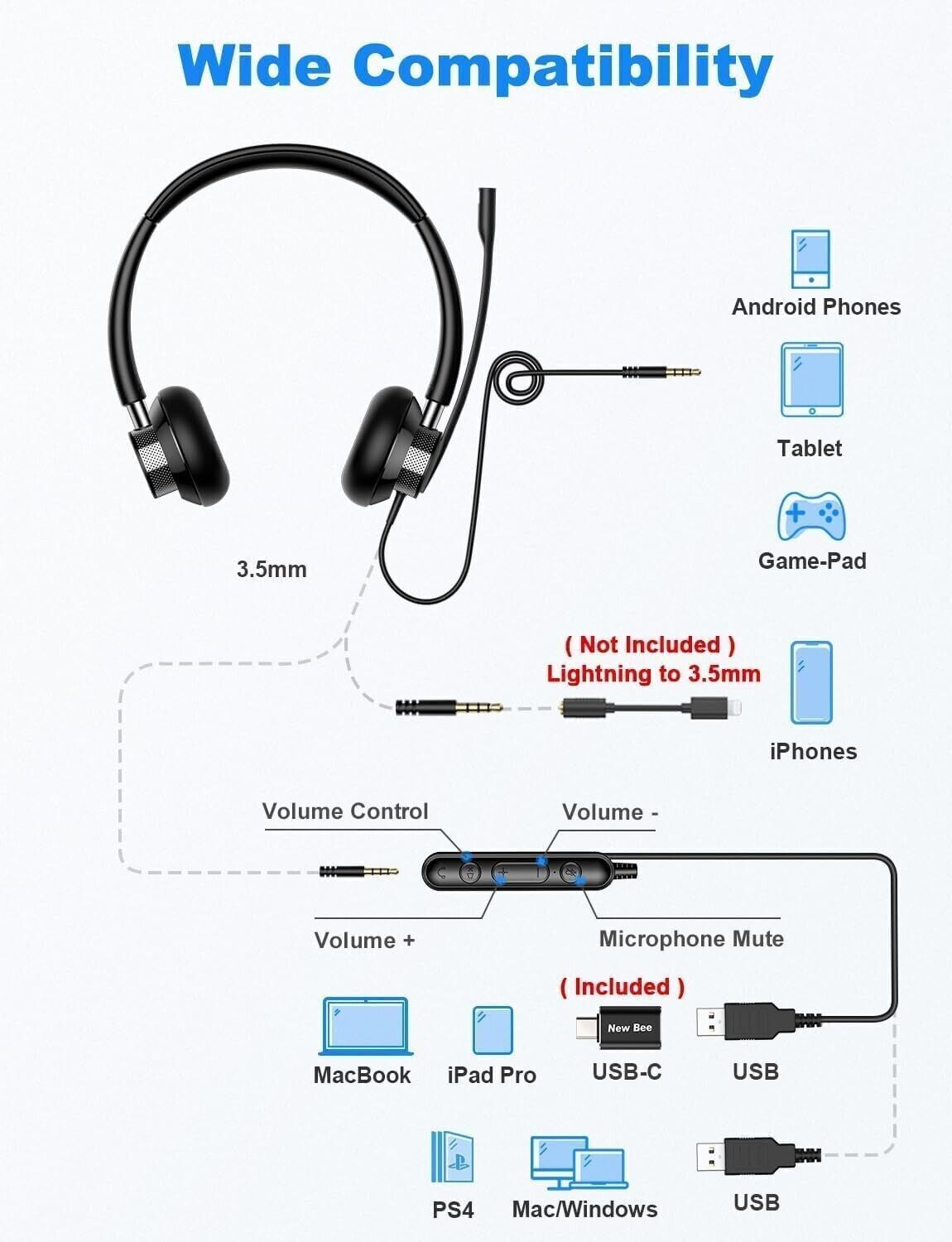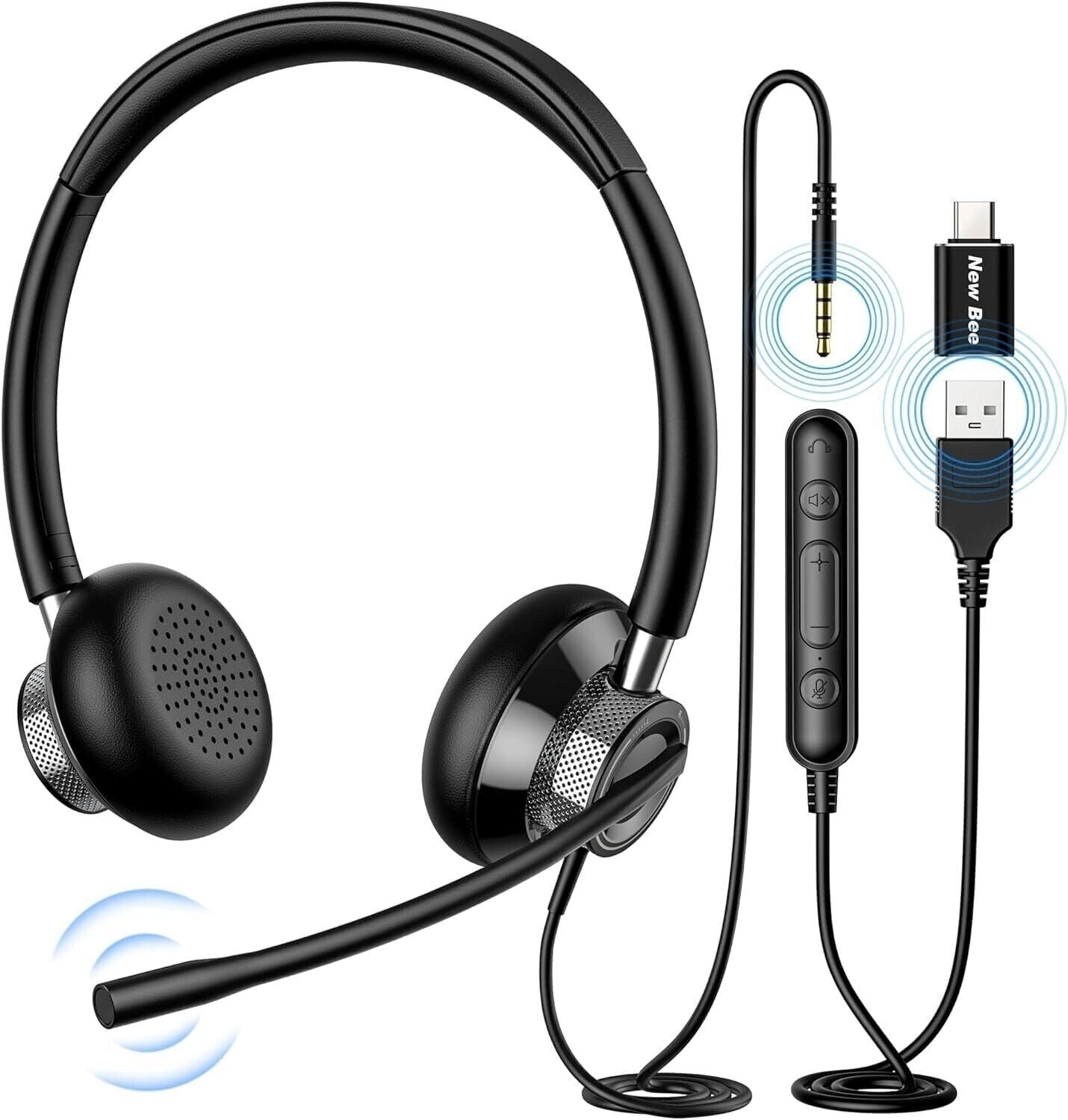New bee Cuffie con Microfono, Cuffie con Filo PC, Cuffie Stereo da 3.5 mm Tipo C USB Auricolari con Cancellazione del Rumore per Telefono Headset Business per Computer Pad Smartphone