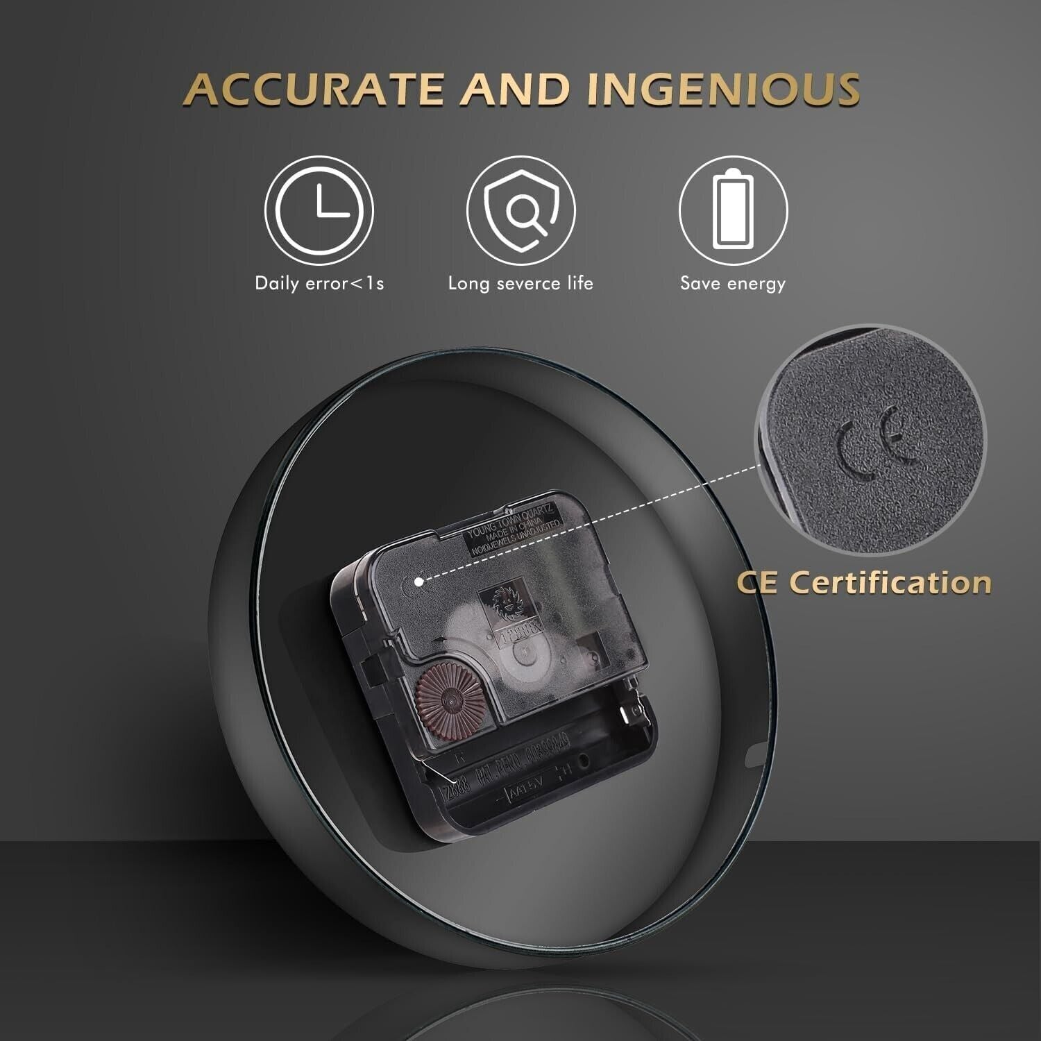 Movimento Silenzioso Preciso: Movimento del Sole silenzioso, preciso, la precisione giornaliera è più o meno 1 secondo, Alimentato da batteria AA, passa la certificazione di CE, può ridurre efficacemente il consumo energetico e prolungare la durata. Tranquillo e silenzioso durante il funzionamento, e Le da una notte tranquilla